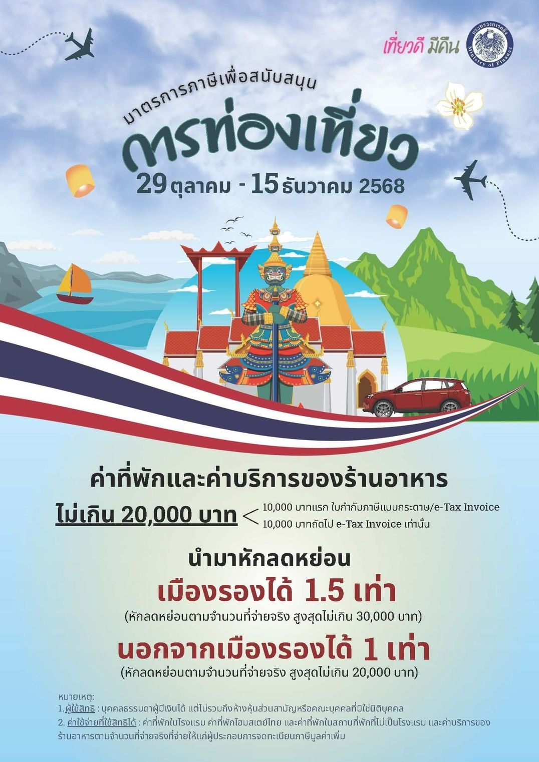 “มาตรการภาษีสำหรับบุคคลธรรมดาเพื่อสนับสนุนการท่องเที่ยว รัฐบาลตั้งเป้าสร้างเม็ดเงินหมุนเวียนและสร้างความสุข สร้างความคึกคักให้บรรยากาศท่องเที่ยวไทยในช่วงปลายปี ให้พี่น้องชาวไทยทั่วประเทศอย่างเป็นรูปธรรม ถือเป็นการเร่งฟื้นฟูเศรษฐกิจไทยผ่านภาคการท่องเที่ยว โดยมุ่งให้เกิดการหมุนเวียนรายได้ในทุกระดับ ตั้งแต่ผู้ประกอบการรายย่อยจนถึงธุรกิจโรงแรมขนาดใหญ่ และเป็นการกระตุ้นการท่องเที่ยวแบบพาเงินออกนอกเมืองใหญ่ สู่พื้นที่ที่ยังมีศักยภาพรอการค้นพบ ซึ่งไม่ใช่แค่ทริป แต่เป็นการช่วยให้เศรษฐกิจของประเทศเติบโตจากมือของเราเอง”