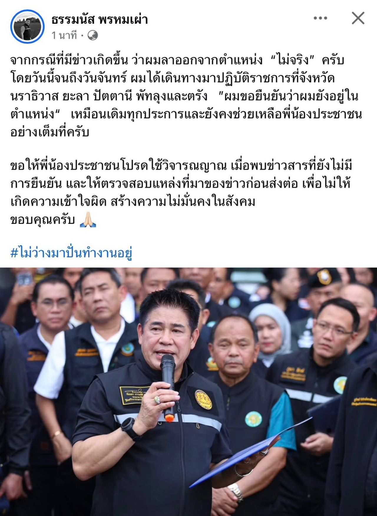เมื่อเวลา 20.00 น. วันที่ 7 พ.ย. 2568 ร.อ.ธรรมนัส พรหมเผ่า รองนายกรัฐมนตรี และรัฐมนตรีว่าการกระทรวงเกษตรและสหกรณ์ โพสต์เฟสบุ๊คส่วนตัวว่า “จากกรณีที่มีข่าวเกิดขึ้น ว่าผมลาออกจากตำแหน่ง ไม่จริงครับ โดยวันนี้จนถึงวันจันทร์ ผมได้เดินทางมาปฏิบัติราชการที่จังหวัดนราธิวาส ยะลา ปัตตานี พัทลุงและตรัง ผมขอยืนยันว่าผมยังอยู่ในตำแหน่งเหมือนเดิมทุกประการและยังคงช่วยเหลือพี่น้องประชาชนอย่างเต็มที่ครับ”