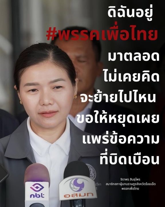 ซึ่งทีมรองโฆษกพรรคเพื่อไทยต่างก็แชร์ข้อความยืนยันของทั้งน.ส.จิราพร อดีตรมต.ประจำสำนักนายกรัฐมนตรี และชญาภา สินธุไพร รองโฆษกพรรคเพื่อไทย ว่ายังคงอยู่พรรคเพื่อไทย