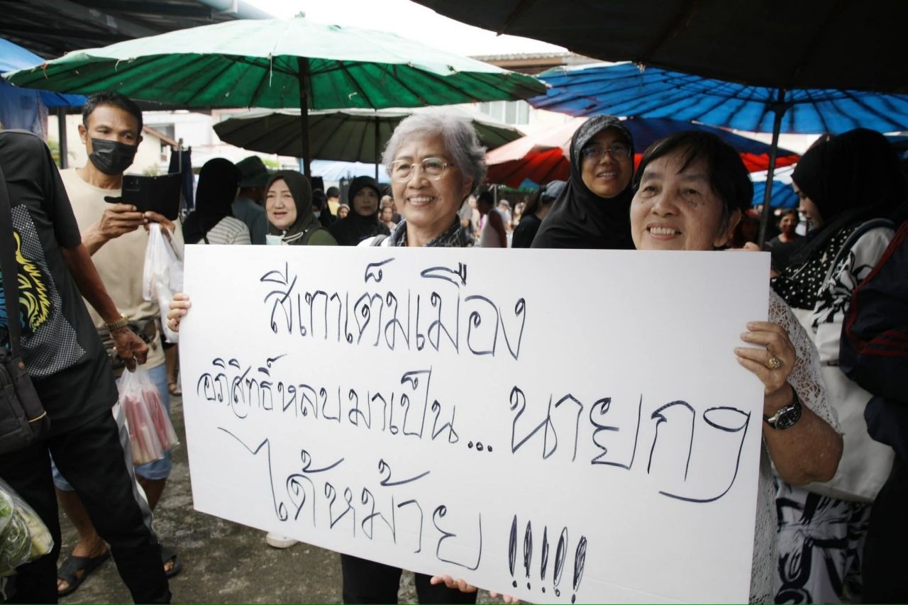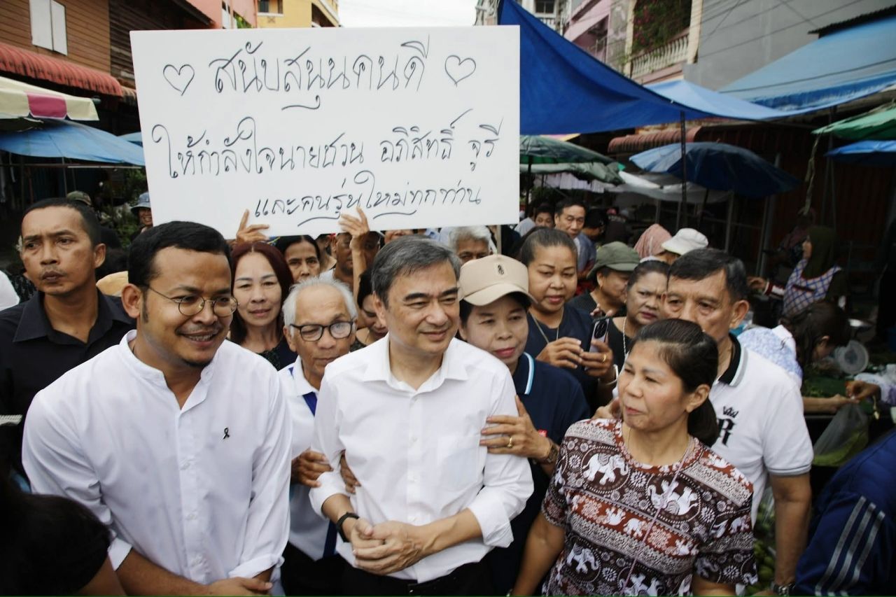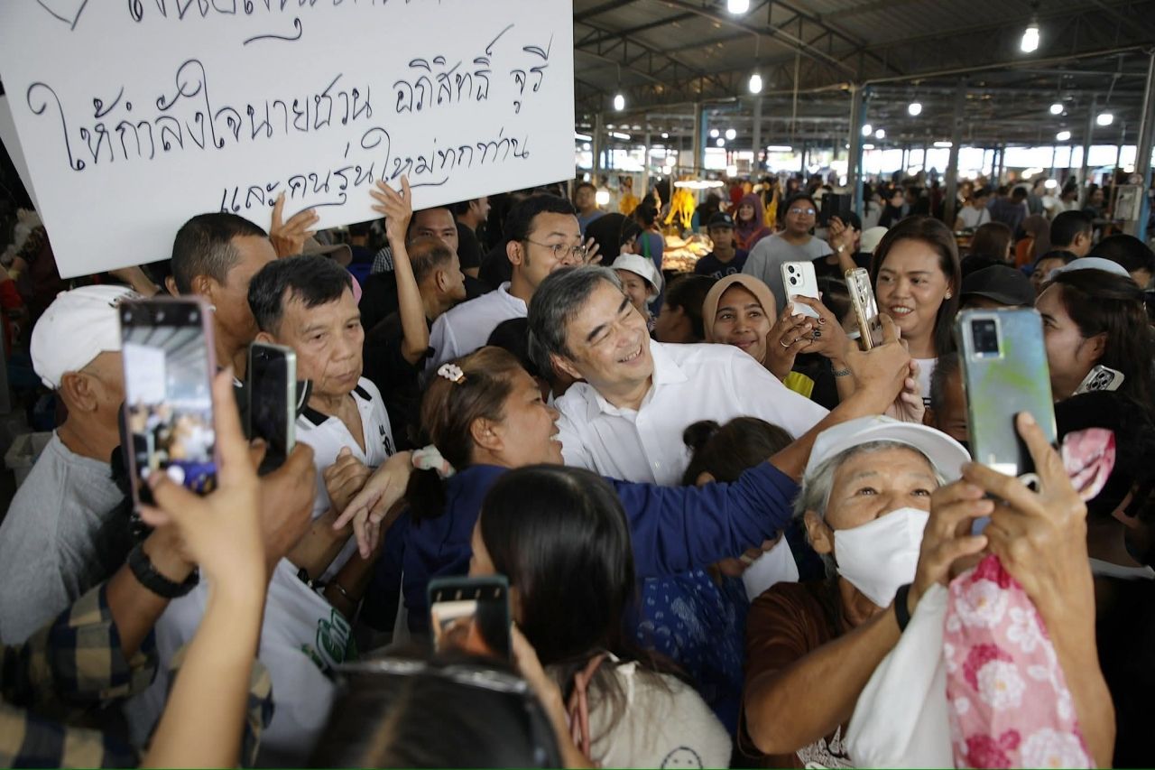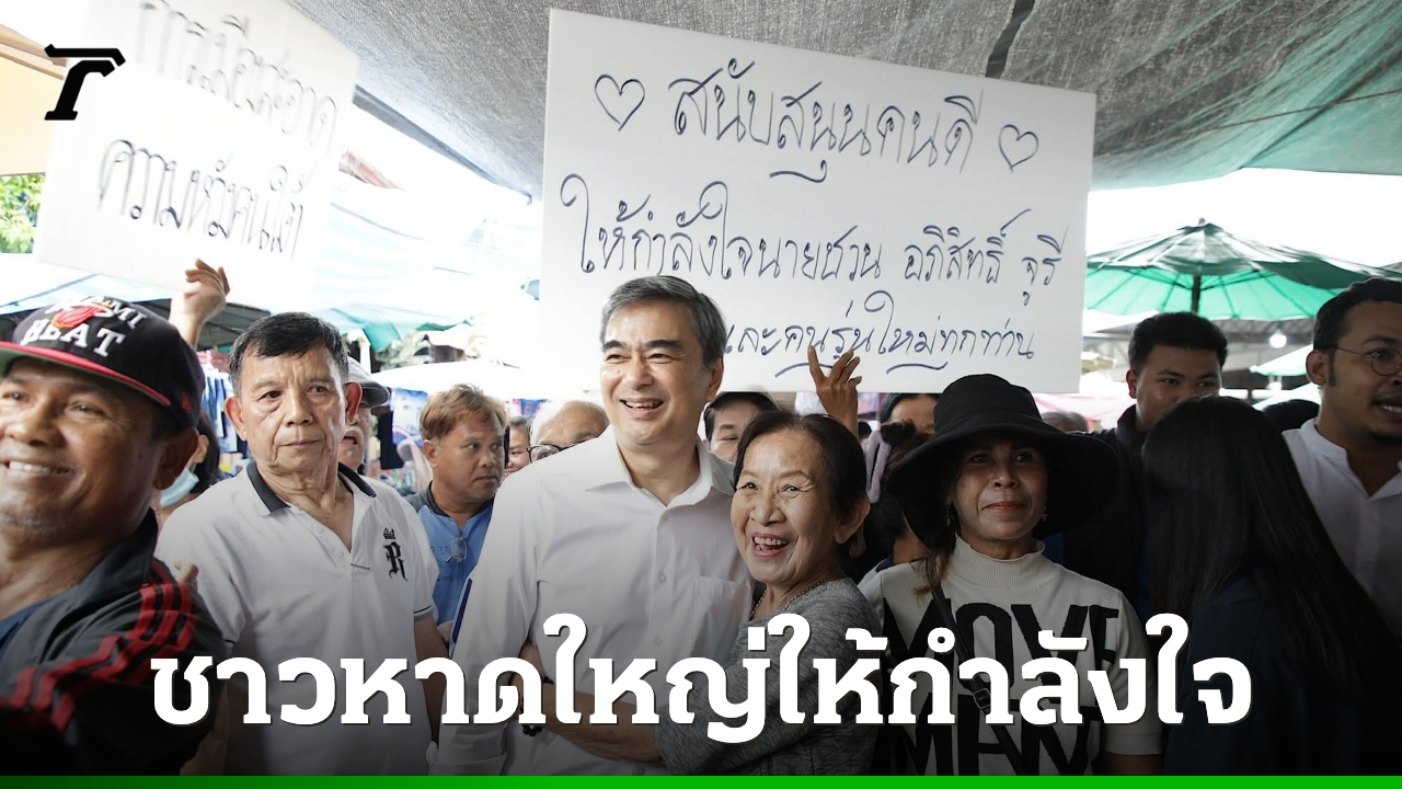 ตลาดแตก ชาวหาดใหญ่ให้กำลังใจ “อภิสิทธิ์ เวชชาชีวะ” ลงพื้นที่ภาคใต้ครั้งแรกหลังกลับมาเป็นหัวหน้าพรรค ชูป้ายคิดถึงอย่างแรง