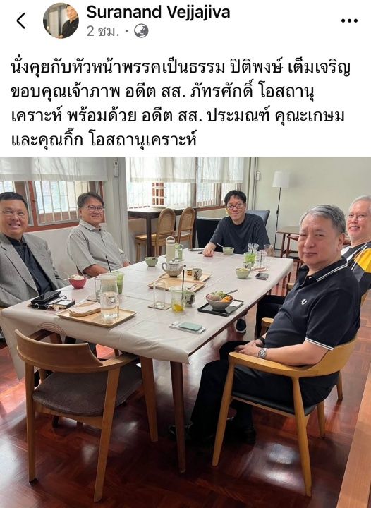 วันที่ 20 พ.ย. ผู้สื่อข่าวรายงานว่า นายสุรนันทน์ เวชชาชีวะ อดีต รมต.ประจำสำนักนายกรัฐมนตรี และอดีต สส.พรรคไทยรักไทย (ทรท.) ได้โพสต์ภาพผ่านเฟซบุ๊ก ขณะนั่งร่วมรับประทานอาหารกับนายปิติพงศ์ เต็มเจริญ หัวหน้าพรรคเป็นธรรม (ปธ.) พร้อมด้วยนายภัทรศักดิ์ โอสถานุเคราะห์ นายวชิระมณฑ์ คุณะเกษมธนาวัฒน์ หรือเดิมชื่อ ประมณฑ์ คุณะเกษม โดยทั้ง 4 คน เป็นอดีต สส.พรรคไทยรักไทย พร้อมด้วย นายอนิศ โอสถานุเคราะห์ นักธุรกิจและไลฟ์โค้ช น้องชายของนายภัทรศักดิ์ ร่วมนั่งพูดคุยด้วย โดยนายสุรนันทน์ ยังโพสต์ข้อความด้วยว่า นั่งคุยกับหัวหน้าพรรคเป็นธรรม ปิติพงศ์ เต็มเจริญ ขอบคุณเจ้าภาพ อดีต สส.ภัทรศักดิ์ โอสถานุเคราะห์ พร้อมด้วย อดีต สส.ประมณฑ์ คุณะเกษม และคุณกิ๊ก โอสถานุเคราะห์