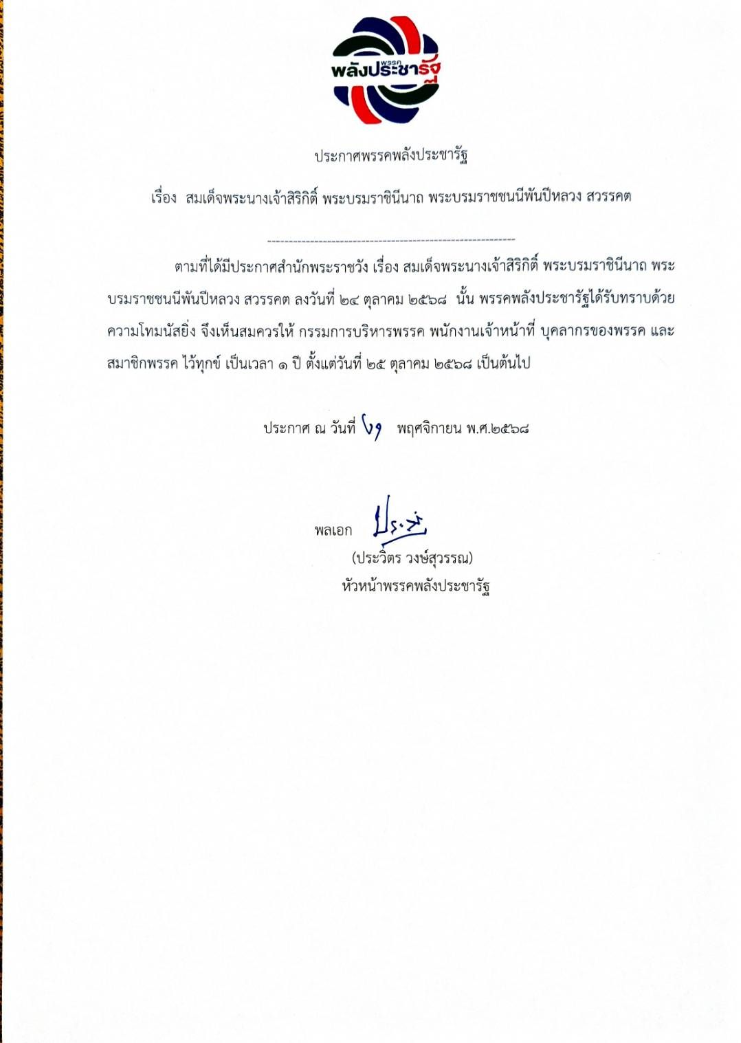 วันที่ 21 พ.ย. 2568 นายไพบูลย์ นิติตะวัน รองหัวหน้าพรรคพลังประชารัฐ เปิดเผยว่า พรรคพลังประชารัฐ ออกประกาศ เรื่องสมเด็จพระนางเจ้าสิริกิติ์ พระบรมราชินีนาถ พระบรมราชชนนีพันปีหลวง สวรรคต ตามที่ได้มีประกาศสำนักพระราชวัง เรื่องสมเด็จพระนางเจ้าสิริกิติ์ พระบรมราชินีนาถ พระบรมราชชนนีพันปีหลวง สวรรคต ลงวันที่ 24 ตุลาคม 2568 นั้น