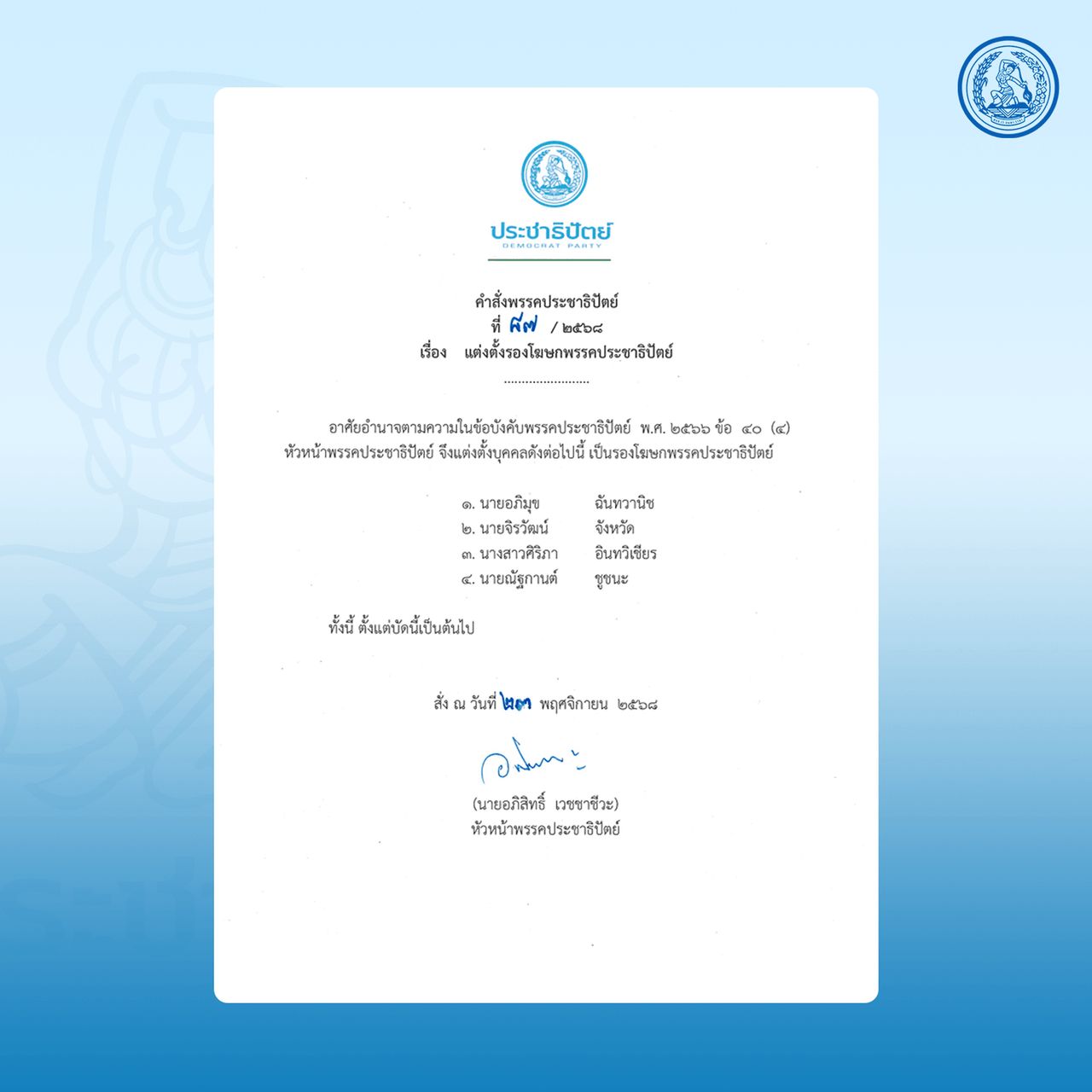 วันที่ 23 พฤศจิกายน 2568 พรรคประชาธิปัตย์ แต่งตั้งรองโฆษกคนใหม่ เพื่อรับฟัง และสะท้อนเสียงของประชาชนให้ดังยิ่งขึ้น โดยประกอบด้วย 1.อภิมุข ฉันทวานิช 2.จิรวัฒน์ จังหวัด 3.ศิริภา อินทวิเชียร และ4.ณัฐกานต์ ชูชนะ