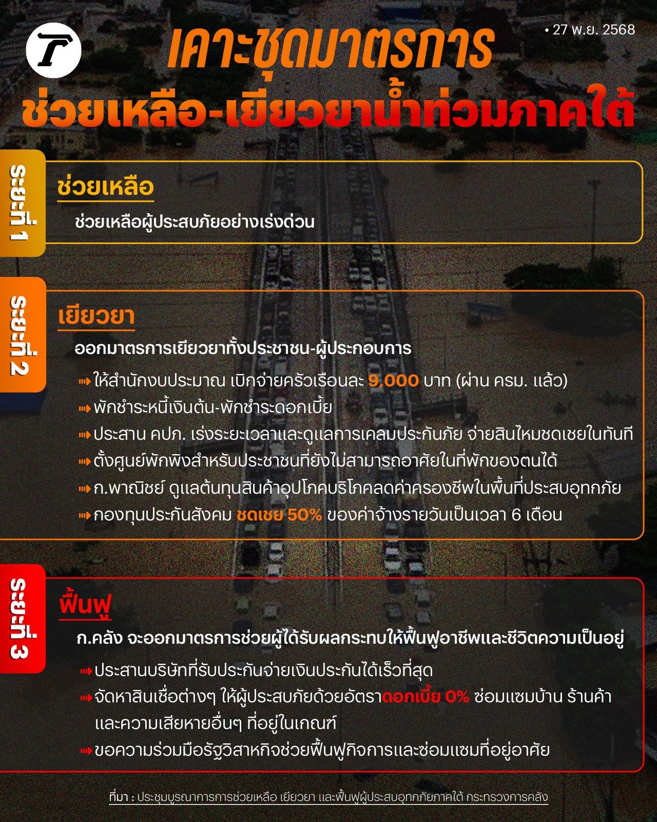 รัฐบาลเคาะมาตรการเร่งด่วนช่วยน้ำท่วมใต้ พักหนี้ พักดอก สินเชื่อดอกเบี้ย 0% เคลมประกันรถยนต์จมน้ำ เงินต้องเข้าทันที นายกฯ ลั่น ใช้ทุกวินาทีช่วยผู้ประสบภัย ส่งรองนายกฯ ประจำพื้นที่หมดแล้ว