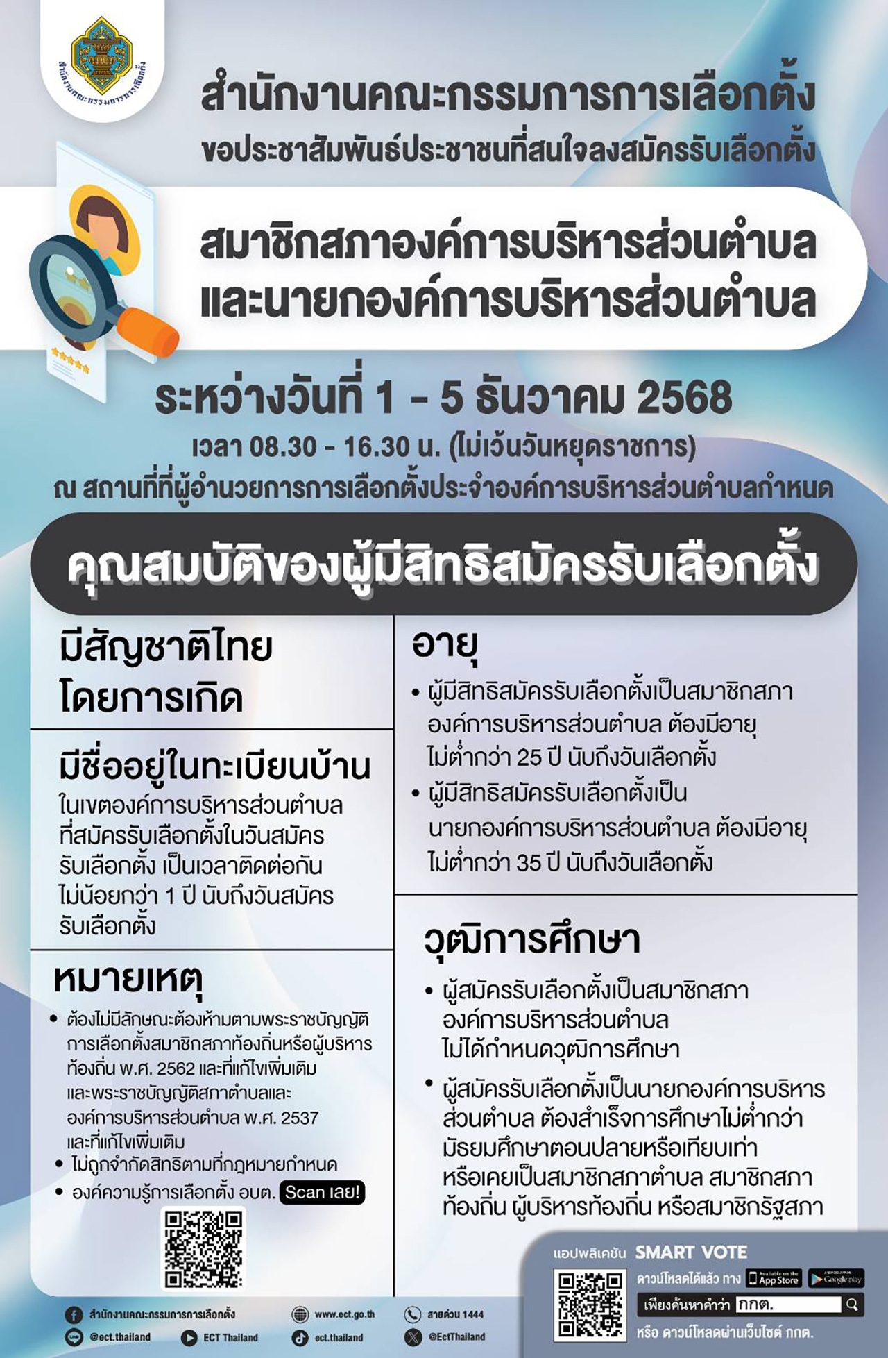 สำนักงานคณะกรรมการการเลือกตั้ง ขอเชิญชวนผู้ที่สนใจสมัครรับเลือกตั้งสมาชิก สภาองค์การบริหารส่วนตำบลและนายกองค์การบริหารส่วนตำบล ระหว่างวันที่ 1 – 5 ธันวาคม 2568 เวลา 08.30 – 16.30 น. (ไม่เว้นวันหยุดราชการ) ณ สถานที่ที่ผู้อำนวยการการเลือกตั้งประจำองค์การบริหารส่วนตำบลกำหนด