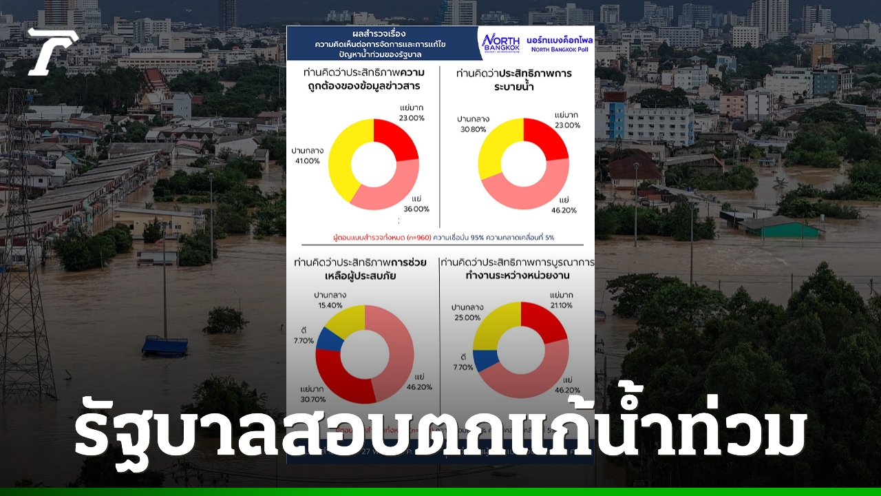 วันที่ 3 ธันวาคม 2568 นายสานิต ศิริวิศิษฐ์กุล หัวหน้าศูนย์สำรวจความคิดเห็น “นอร์ทแบงค็อกโพล” มหาวิทยาลัยนอร์ทกรุงเทพ เปิดเผยผลสำรวจความคิดเห็นของประชาชนทั่วทุกภาค จำนวน 960 คน ต่อการจัดการปัญหาน้ำท่วมของรัฐบาล ซึ่งปรากฏว่าประชาชนส่วนใหญ่ไม่พอใจการบริหารจัดการอย่างท่วมท้น โดยหัวข้อประสิทธิภาพโดยรวม ประชาชนให้คะแนน แย่มาก กว่า 92% และความไม่พอใจสูงสุด 92.3%