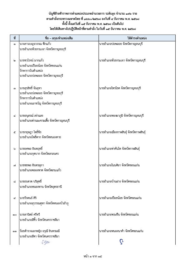 นอกจากนี้ ยังมีคำสั่งกระทรวงมหาดไทย ที่ 3660/2568 เรื่องย้ายข้าราชการ ตำแหน่งประเภทอำนวยการ ระดับสูง อีก 196 ราย ลงวันที่ 4 ธันวาคม 2568 โดยให้เดินทางไปปฏิบัติหน้าที่ตามคำสั่งในวันที่ 15 ธันวาคม 2568 ซึ่งคำสั่งนี้เป็นการแต่งตั้งโยกย้ายนายอำเภอทั่วประเทศ 196 ราย