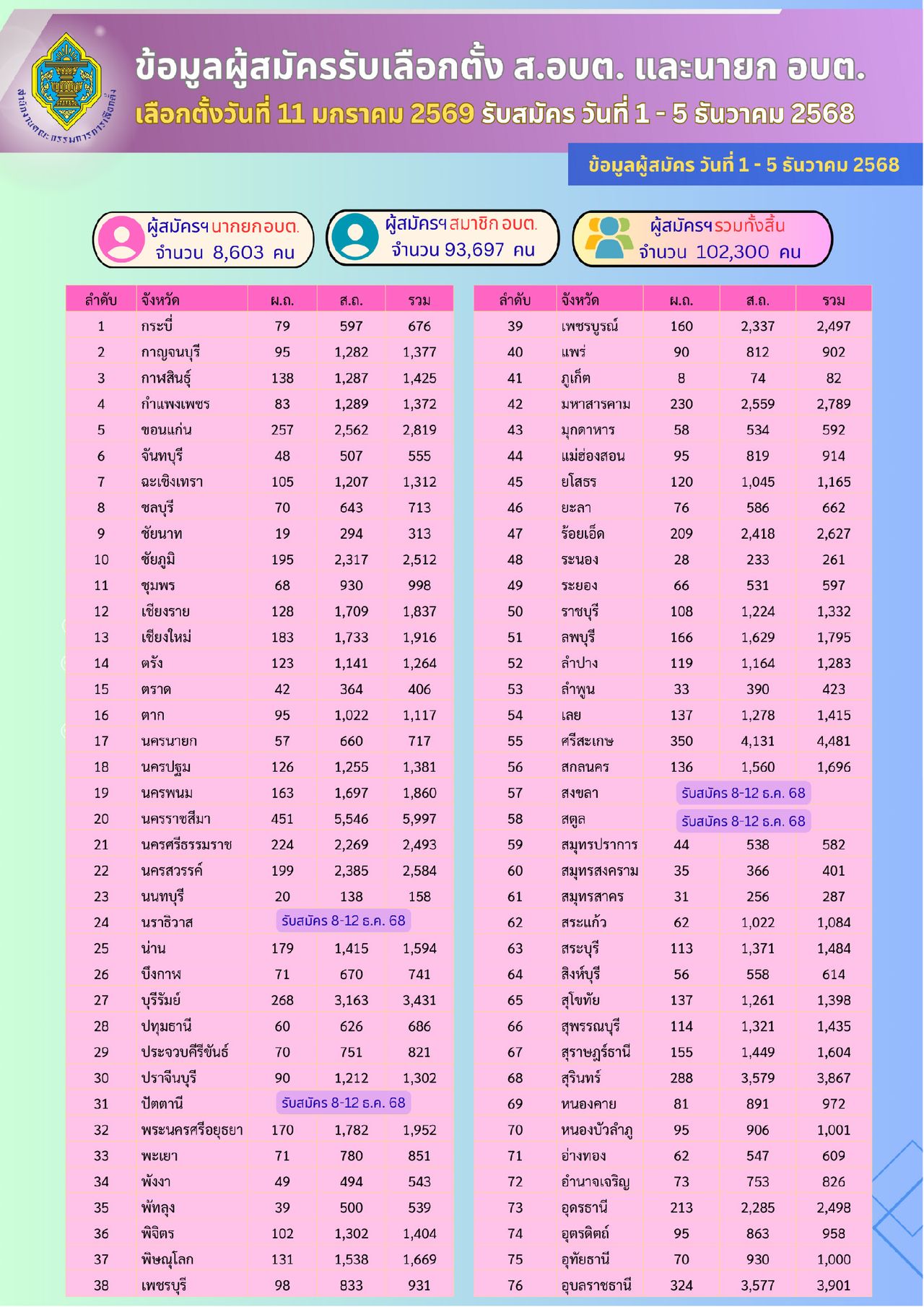 กกต. สรุปผลรับสมัครเลือกตั้ง นายก อบต.-ส.อบต. รวม 5 วัน 102,300 คน ขณะที่อีก 4 จังหวัด นราธิวาส ปัตตานี สงขลา และสตูล เปิดรับสมัคร 8-12 ธ.ค.นี้ เหตุได้รับผลกระทบจากน้ำท่วมภาคใต้