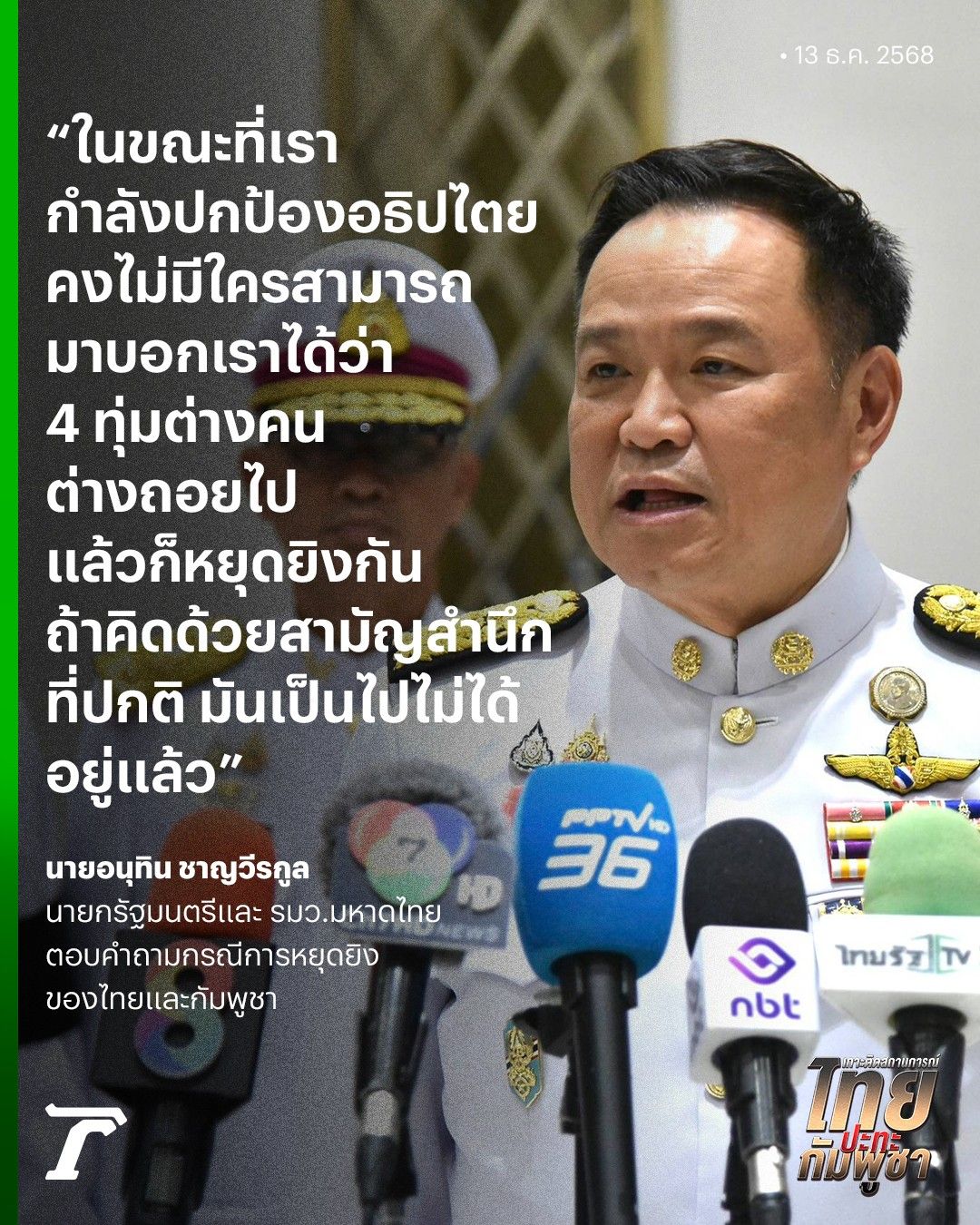 นายกรัฐมนตรี เผยต่อ ถ้าจะหยุดจริงจริงกัมพูชาต้องเสนอข้อดำเนินการมาที่ประเทศไทย ไม่ใช่ให้ผู้นำประเทศอื่นมาพูด เพราะเรามีเรื่องกันอยู่ ถ้าจะดำเนินการใดที่อยากหยุดข้อพิพาทกัน ฝ่ายใดฝ่ายหนึ่งต้องเสนอมา อย่างเช่นเมื่อวานนี้ (12 ธันวาคม 2568) ที่บอกว่าหยุดยิงแล้ว แต่ตอนเช้าก็ยังมีเป้าหมายที่ไม่ใช่ทางทหาร และมาโดนประชาชนของไทย ทำให้เกิดความเสียหาย ดังนั้น การกระทำมันชัดเจนอยู่แล้ว การจะพูดอะไรก็พูดได้แต่ต้องทำด้วย ถ้าหยุดจริงก็ต้องหยุดยิงให้เห็น และต้องถอนความพร้อมในเรื่องการยิง ไม่ใช่ปืนยังเล็งมาที่ประเทศไทย และพร้อมยิงอยู่ ถ้าอยากหยุดจริงก็ต้องหยุดทั้งหมด หยุดความพร้อมทุกอย่างและถอยกลับไป ซึ่งคนที่จะประเมินคือประเทศไทย ว่าแบบนี้เริ่มคุยกันได้ ซึ่งเป็นวิธีที่ถูกต้อง ไม่ใช่ใช้การพูดคุยผ่านโซเชียลมีเดีย เพราะนี่เป็นเรื่องของประเทศ