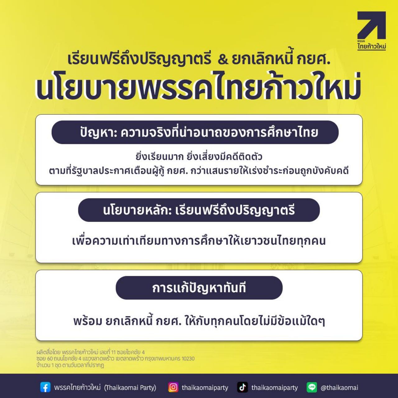 นอกจากนี้ ยังมีนโยบายเรียนฟรีถึงปริญญาตรี และยกเลิกหนี้ กยศ. ด้วย