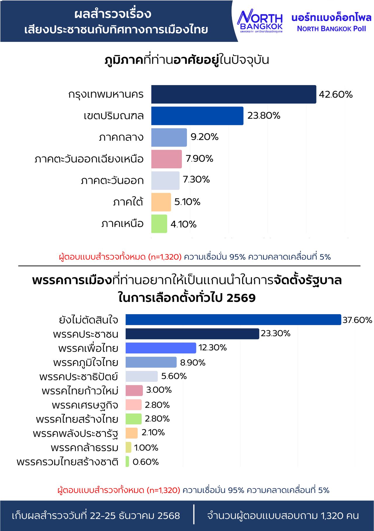 วันที่ 26 ธันวาคม 2568 ผศ.ดร.สานิต ศิริวิศิษฐ์กุล หัวหน้าศูนย์สำรวจความคิดเห็นนอร์ทแบงค็อกโพล มหาวิทยาลัยนอร์ทกรุงเทพ เปิดเผยว่า จากการสำรวจความคิดเห็นของประชาชน ระหว่างวันที่ 22-25 ธันวาคม 2568 จำนวน 1,320 ตัวอย่าง จากกลุ่มตัวอย่างทุกภูมิภาคทั่วประเทศในประเด็น “เสียงประชาชนกับทิศทางการเมืองไทย” โดยคำถามว่าภูมิภาคที่ท่านอาศัยอยู่ในปัจจุบัน พบว่าผู้ตอบแบบสำรวจพักอาศัยอยู่ในภูมิภาคกรุงเทพมหานคร ร้อยละ 42.60 ปริมณฑล ร้อยละ 23.80 ภาคกลาง ร้อยละ 9.20 ภาคตะวันออกเฉียงเหนือ ร้อยละ 7.90 ภาคตะวันออก ร้อยละ 7.30 ภาคใต้ ร้อยละ 5.10 และภาคเหนือ ร้อยละ 4.10