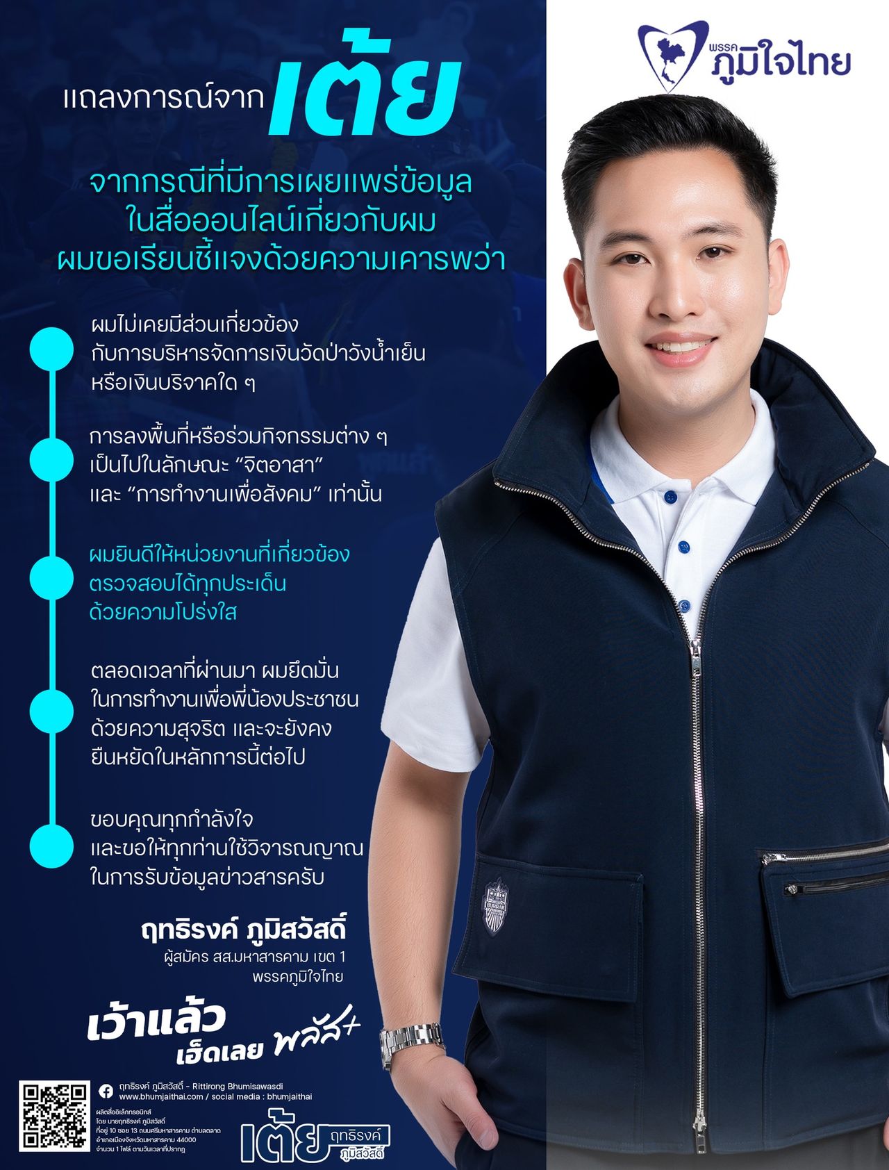 วันที่ 30 ธันวาคม 2568 จากกรณีเพจ CSI LA โพสต์ภาพและข้อความพร้อมตั้งข้อสังเกตให้ตรวจสอบกรณีอดีตคนขับรถของวัดป่าวังน้ำเย็น จ.มหาสารคาม ซึ่งปัจจุบันลงสมัครรับเลือกตั้ง โดยอ้างว่ามีฐานะร่ำรวยรวดเร็วผิดปกติภายในระยะเวลาไม่กี่ปีนั้น ล่าสุดวันนี้ นายฤทธิรงค์ ภูมิสวัสดิ์ ผู้สมัคร สส.มหาสารคาม พรรคภูมิใจไทย (ภท.) โพสต์ข้อความผ่านเฟซบุ๊กชี้แจงการนำข้อมูลดังกล่าวมาเผยแพร่ว่าเป็นการโจมตีทางการเมือง พร้อมยืนยันประกอบอาชีพธุรกิจส่วนตัวมาเป็นเวลากว่า 10 ปี ด้วยความสุจริต มีทั้งห้างร้านและบริษัทที่ดำเนินกิจการถูกต้อง รายได้มีที่มา สามารถตรวจสอบได้จากข้อมูลการเสียภาษี และเคยดำรงตำแหน่งสมาชิกสภาเทศบาล (สท.) มาแล้ว 2 สมัย