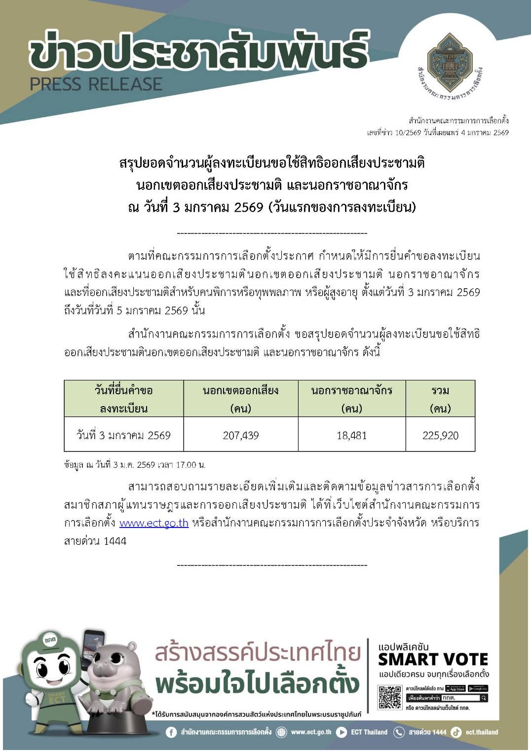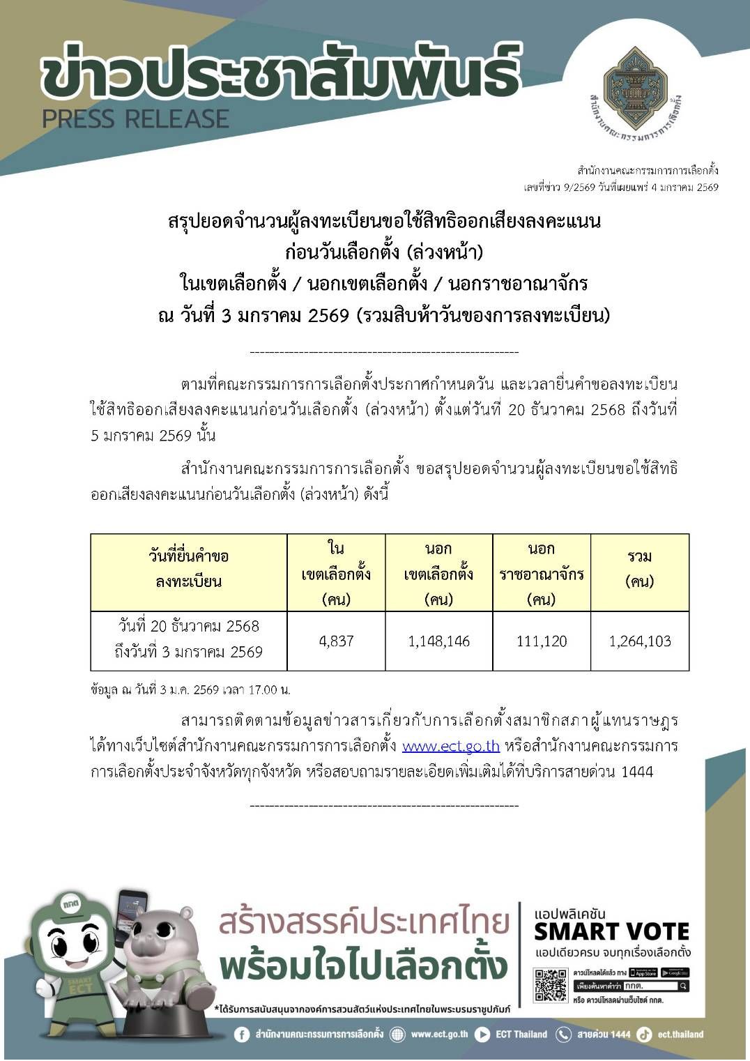 วันที่ 4 มกราคม 2569 สำนักงานคณะกรรมการการเลือกตั้ง หรือ (กกต.) สรุปยอดจำนวนผู้ลงทะเบียนขอใช้สิทธิเลือกตั้งล่วงหน้า ในเขตเลือกตั้ง นอกเขตเลือกตั้งและนอกราชอาณาจักร รวม 15 วันของการเปิดให้ประชาชนลงทะเบียนขอใช้สิทธิเลือกตั้งล่วงหน้า ระหว่างวันที่ 20 ธันวาคม 68 - 3 มกราคม 69 รวมจำนวน 1,264,103 คน พบว่ามีผู้ขอลงทะเบียนขอใช้สิทธิเลือกตั้งล่วงหน้าในเขตเลือกตั้ง จำนวน 4,837 คน มีผู้ขอใช้สิทธิเลือกตั้งล่วงหน้านอกเขตจำนวน 1,148,146 คน และมีผู้ขอลงคะแนนออกเสียงนอกราชอาณาจักรจำนวน 111,120 คน