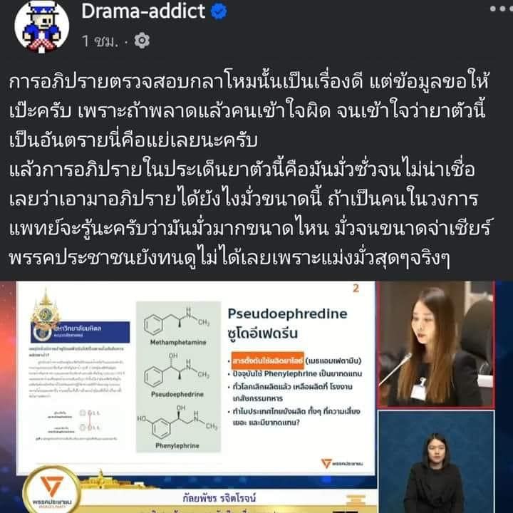 โดยทาง เพจ Drama-addict ได้เคยออกมาทวงติง หมอนิว กัลยพัชร ถึงการอภิปรายเรื่องยาซูโดอีเฟดรีน ว่า “การอภิปรายตรวจสอบกลาโหมนั้นเป็นเรื่องดี แต่ข้อมูลขอให้เป๊ะครับ เพราะถ้าพลาดแล้วคนเข้าใจผิด จนเข้าใจว่ายาตัวนี้ เป็นอันตรายนี่คือแย่เลยนะครับ แล้วการอภิปรายในประเด็นยาตัวนี้คือมันมั่วซั่วจนไม่น่าเชื่อเลยว่าเอามาอภิปรายได้ยังไงมั่วขนาดนี้ ถ้าเป็นคนในวงการแพทย์จะรู้นะครับว่ามันมั่วมากขนาดไหน มั่วจนขนาดจ่าเชียร์พรรคประชาชนยังทนดูไม่ได้เลยเพราะแม่งมั่วสุดๆ จริงๆ”