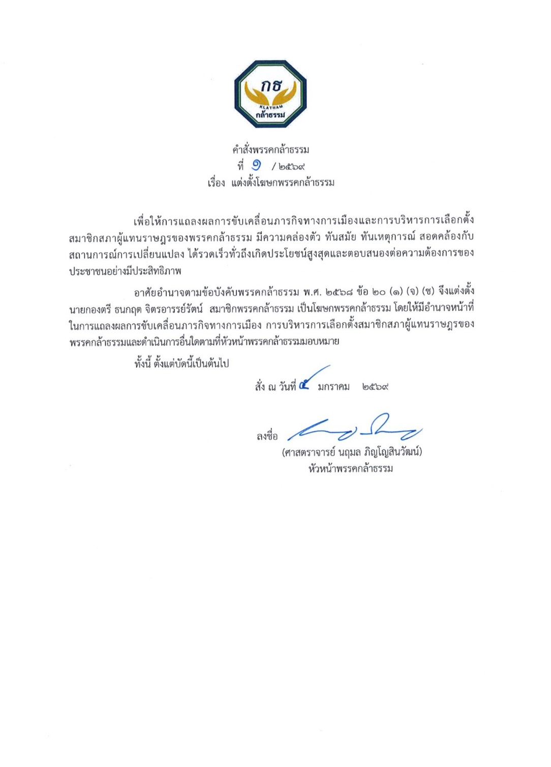 อาศัยอำนาจตามข้อบังคับพรรคกล้าธรรม พ.ศ.2568 ข้อ 20 (1) (จ) (ช) จึงแต่งตั้งนายกองตรี ธนกฤต จิตรอารีย์รัตน์ ผู้สมัครรับเลือกตั้ง สส.บัญชีรายชื่อ พรรคกล้าธรรม เป็นโฆษกพรรคกล้าธรรม โดยให้มีอำนาจหน้าที่ในการแถลงผลการดำเนินงานของคณะกรรมการบริหารพรรคกล้าธรรม สมาชิกสภาผู้แทนราษฎร สังกัดพรรคกล้าธรรม และดำเนินการอื่นใดตามที่หัวหน้าพรรคกล้าธรรมมอบหมาย