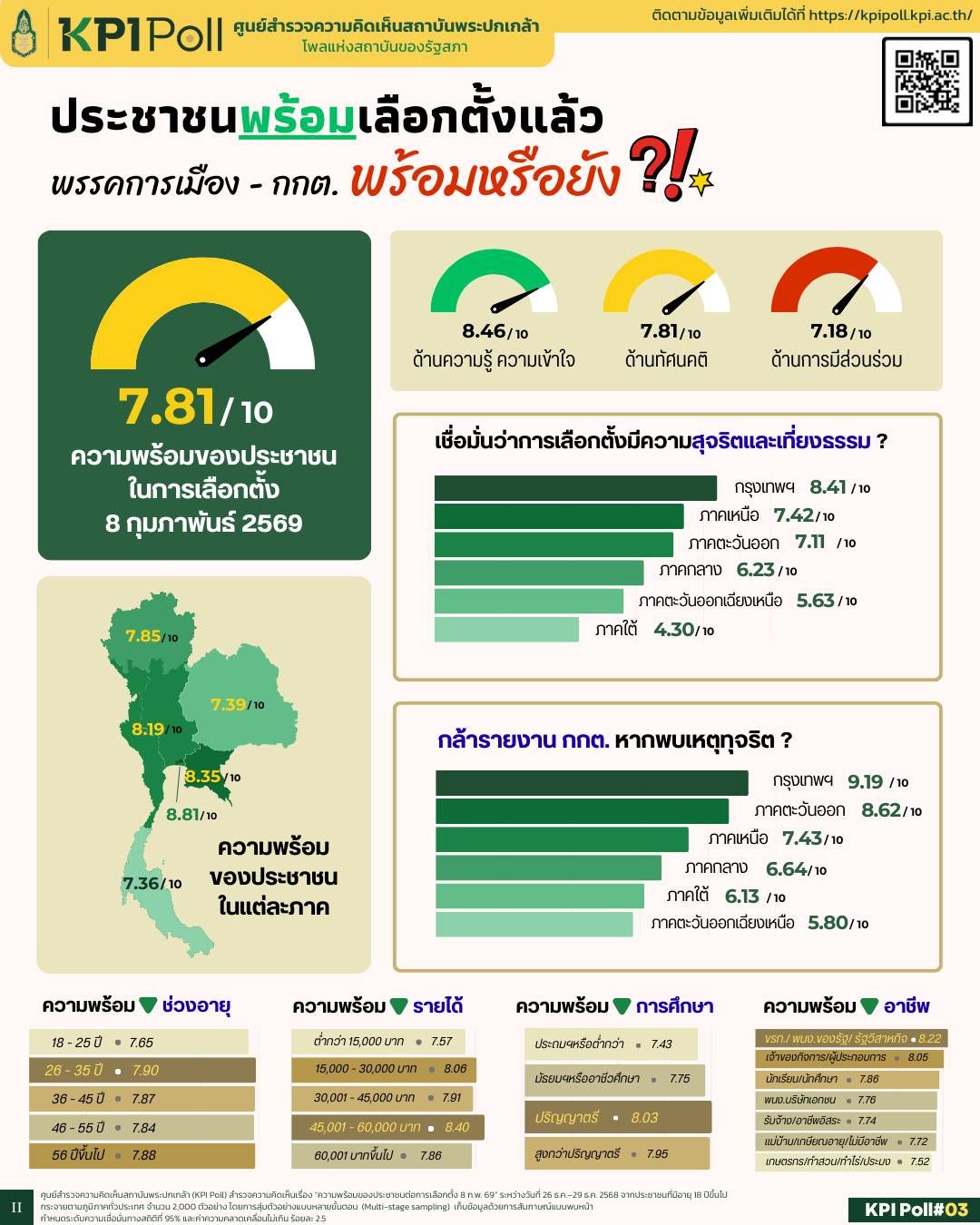 วันที่ 9 มกราคม 2569 รองศาสตราจารย์ ดร.อิสระ เสรีวัฒนวุฒิ เลขาธิการสถาบันพระปกเกล้า ในฐานะประธานศูนย์ KPI Poll เปิดเผยว่า สถาบันพระปกเกล้า ได้สำรวจความคิดเห็นประชาชน เรื่อง “ความพร้อมของประชาชนต่อการเลือกตั้ง 8 ก.พ. 69” ระหว่างวันที่ 26 - 29 ธ.ค. 2568 จากประชาชนที่มีอายุ 18 ปีขึ้นไป กระจายตามภูมิภาคทั่วประเทศ จำนวน 2,000 ตัวอย่าง