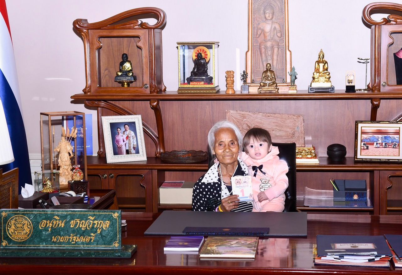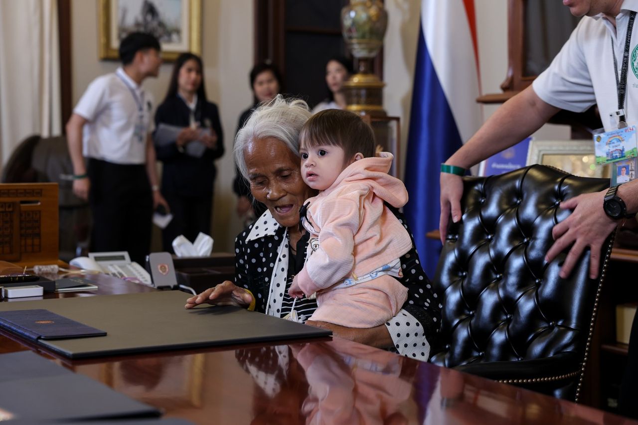 ต่อมาเวลา 08.14 น. น.ส.ไตรศุลี ไตรสรณกุล เลขาธิการนายกรัฐมนตรี ได้พาคุณยายแสงจันทร์ น้องชมพู่ และน้องโชค ขึ้นเยี่ยมชมตึกไทยคู่ฟ้า โดยได้ช่วยอุ้มน้องชมพู่ขึ้นไปยังห้องทำงานนายกรัฐมนตรีด้วยบรรยากาศเป็นกันเอง