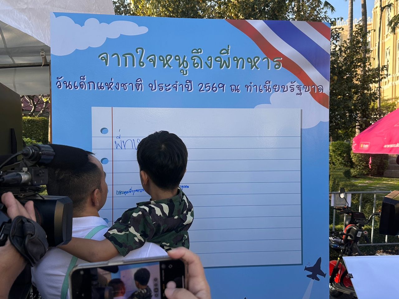 ทำเนียบรัฐบาล คึกคัก ต้อนรับวันเด็กแห่งชาติ 2569 “น้องชมพู่” วัย 1 ขวบ 4 เดือน นั่งเก้าอี้นายกฯ คนแรก ขณะที่เด็กๆ เขียนข้อความส่งกำลังใจถึงพี่ทหารแนวหน้า ขอบคุณที่ปกป้องประเทศ