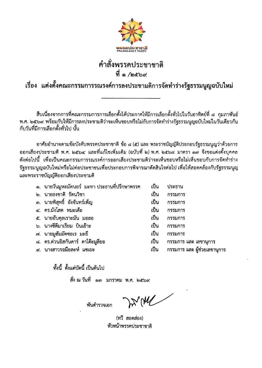 วันที่ 13 ม.ค. 2569 ผู้สื่อข่าวรายงานว่า พ.ต.อ.ทวี สอดส่อง หัวหน้าพรรคประชาชาติ (ปช.) ลงนามคำสั่งแต่งตั้งคณะกรรมการรณรงค์การลงประชามติการจัดทำร่างรัฐธรรมนูญฉบับใหม่