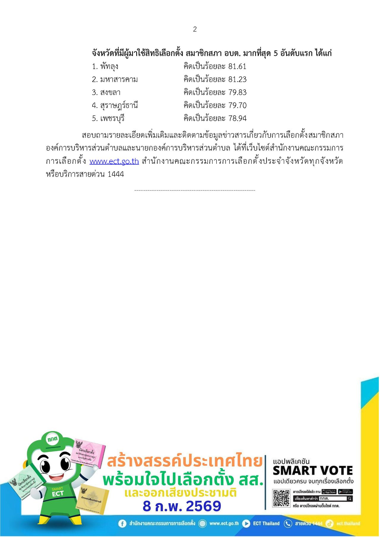 เมื่อเวลา 15.30 น. วันที่ 14 มกราคม 2569 สำนักงานคณะกรรมการการเลือกตั้ง สรุปข้อมูลการใช้สิทธิเลือกตั้งสมาชิกสภาองค์การบริหารส่วนตำบลและนายกองค์การบริหารส่วนตำบล (อย่างไม่เป็นทางการ) ดังนี้ อบต. ที่จัดให้มีการเลือกตั้ง จำนวน 4,985 แห่ง เลือกตั้งนายก อบต. จำนวน 4,500 คน ส.อบต. จำนวน 52,544 เขตเลือกตั้ง รวม 53,143 คน พบมีผู้มาใช้สิทธิ์เลือกตั้งนายก อบต. 16,075,164 คน คิดเป็นร้อยละ 70.46 จากจำนวนผู้มีสิทธิเลือกตั้ง 22,814,030 คน และผู้มาใช้สิทธิเลือกตั้ง ส.อบต. 17,592,239 คน คิดเป็นร้อยละ 69.89 จากจำนวนผู้มีสิทธิ์เลือกตั้ง 25,170,136 คน