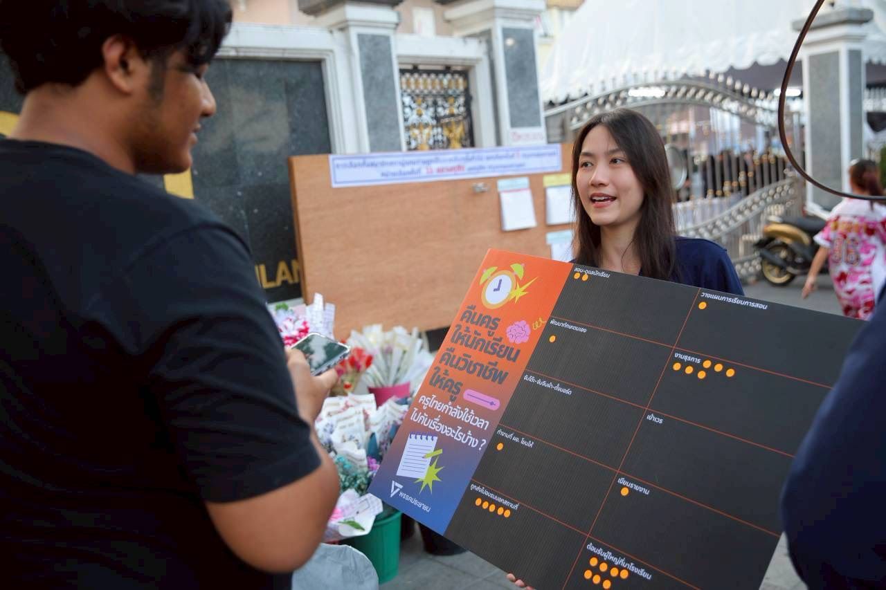 พรรคประชาชน ใช้โอกาสเนื่องในวันครู จัดกิจกรรมหน้าคุรุสภา ชูนโยบาย “คืนเวลาให้ครู คืนครูให้ห้องเรียน” “พริษฐ์” เน้น 3 หลักการลดงานธุรการ พัฒนาทักษะอย่างตรงจุด และส่งเสริมความก้าวหน้าทางอาชีพ