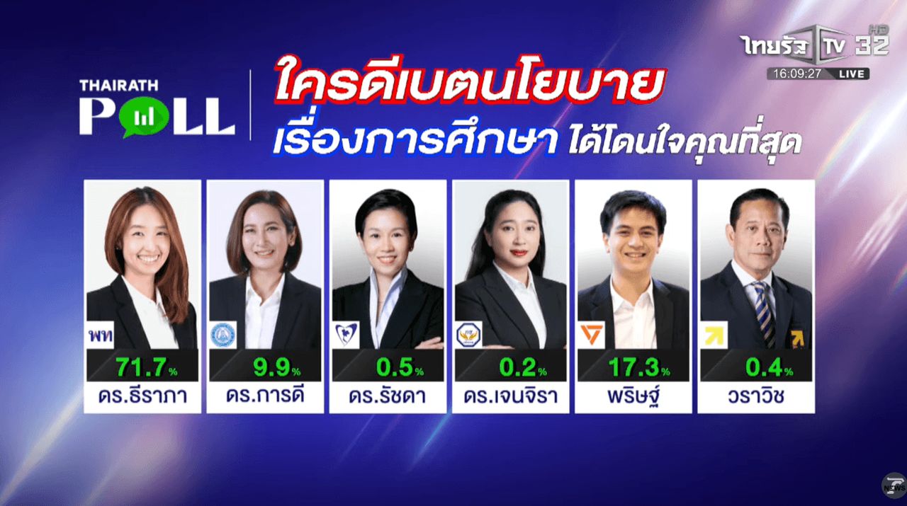 รายการไทยรัฐ นิวส์รูม สเปเชียล จัดรายการพิเศษ ดีเบตประเด็นทางการศึกษา ในหัวข้อ “เรียนไปทำไม? ผ่าตัดการศึกษาไทย ทวงคืนอนาคต” โดยมีตัวแทนจากพรรคการเมืองที่ลงสู้ศึกเลือกตั้งในวันที่ 8 กุมภาพันธ์ 2569 ร่วมประชันวิสัยทัศน์ ได้แก่ ธีราภา ไพโรหกุล ตัวแทนจากพรรคเพื่อไทย, การดี เลียวไพโรจน์ แคนดิเดตนายกรัฐมนตรีจากพรรคประชาธิปัตย์, รัชดา ธนาดิเรก จากพรรคภูมิใจไทย, เจนจิรา รัตนเพียร ตัวแทนจากพรรคกล้าธรรม, พริษฐ์ วัชรสินธุ์ พรรคประชาชน และวราวิช กำภู ณ อยุธยา จากพรรคไทยก้าวใหม่