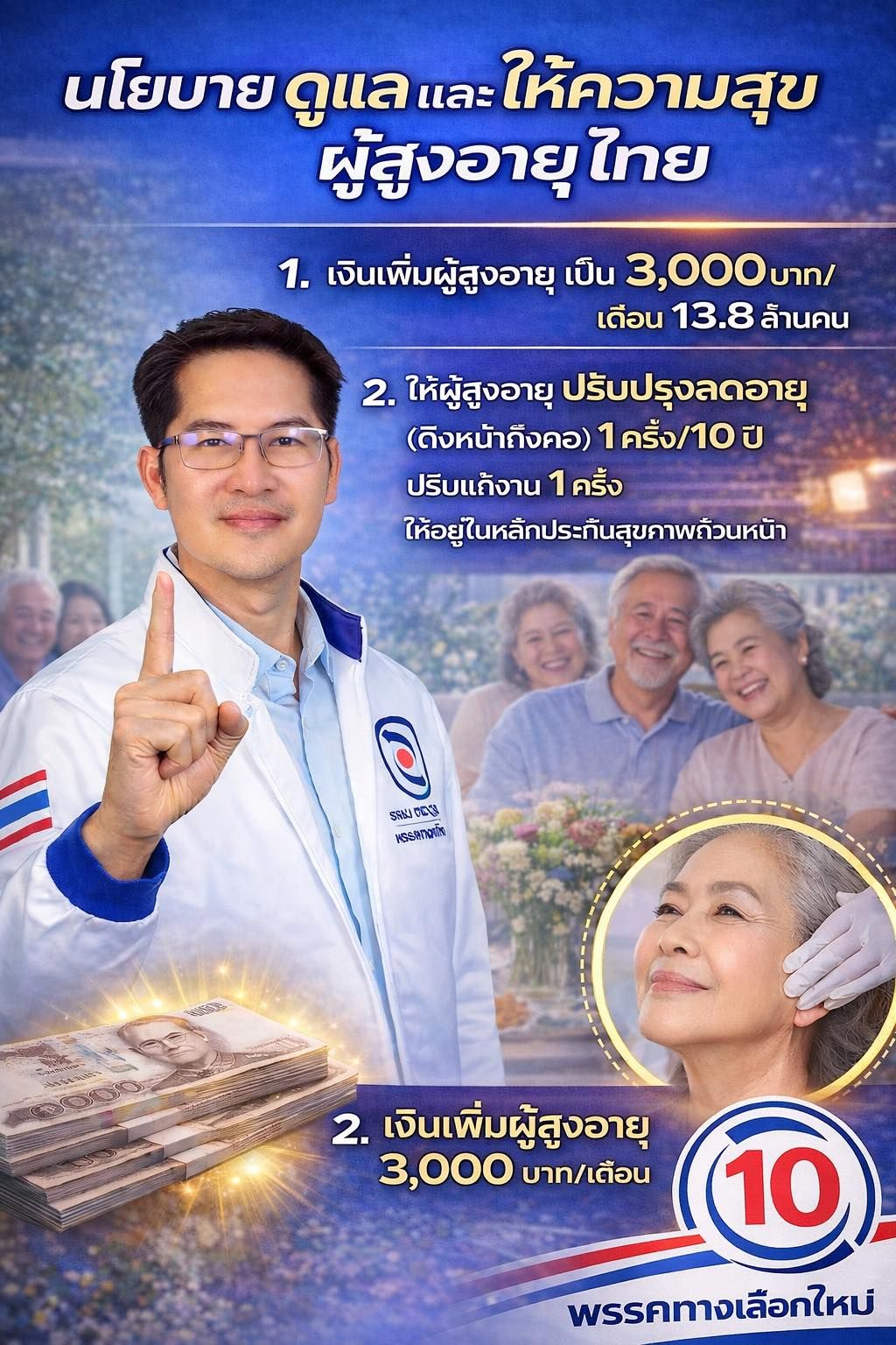 นอกจากนี้ยังมีนโยบายดูแล และให้ความสุข ผู้สูงอายุไทย โดยเพิ่มเงินเพิ่มผู้สูงอายุเป็น 3,000 บาท/เดือน 13.8 ล้านคน ให้ผู้สูงอายุ ปรับปรุงลดอายุ(ดึงหน้าถึงคอ) 1 ครั้ง/10 ปี ปรับแก้งาน 1 ครั้ง ให้อยู่ในหลักประกันสุขภาพถ้วนหน้า