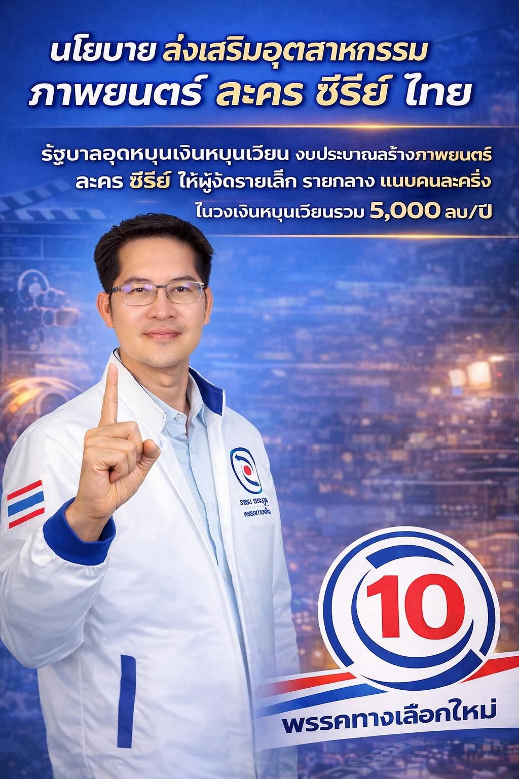 รวมถึงมีนโยบายส่งเสริมอุตสาหกรรมภาพยนตร์ ละคร ซีรีส์ ไทย โดยรัฐบาลอุดหนุนเงินหมุนเวียน งบประมาณสร้างภาพยนตร์ ละคร ซีรีส์ ให้ผู้จัดรายเล็ก รายกลาง แบบคนละครึ่ง ในวงเงินหมุนเวียนรวม 5,000 ลบ./ปี (รัฐบาลออกเงินลงทุนช่วงแรก 50% อีก 50% รัฐบาลค้ำประกันให้โดยเอกชนกู้ธนาคารรัฐ-เอกชน คืนเงินต้นให้รัฐบาล ดอกเบี้ย 0% หลังดำเนินการขายเสร็จ)