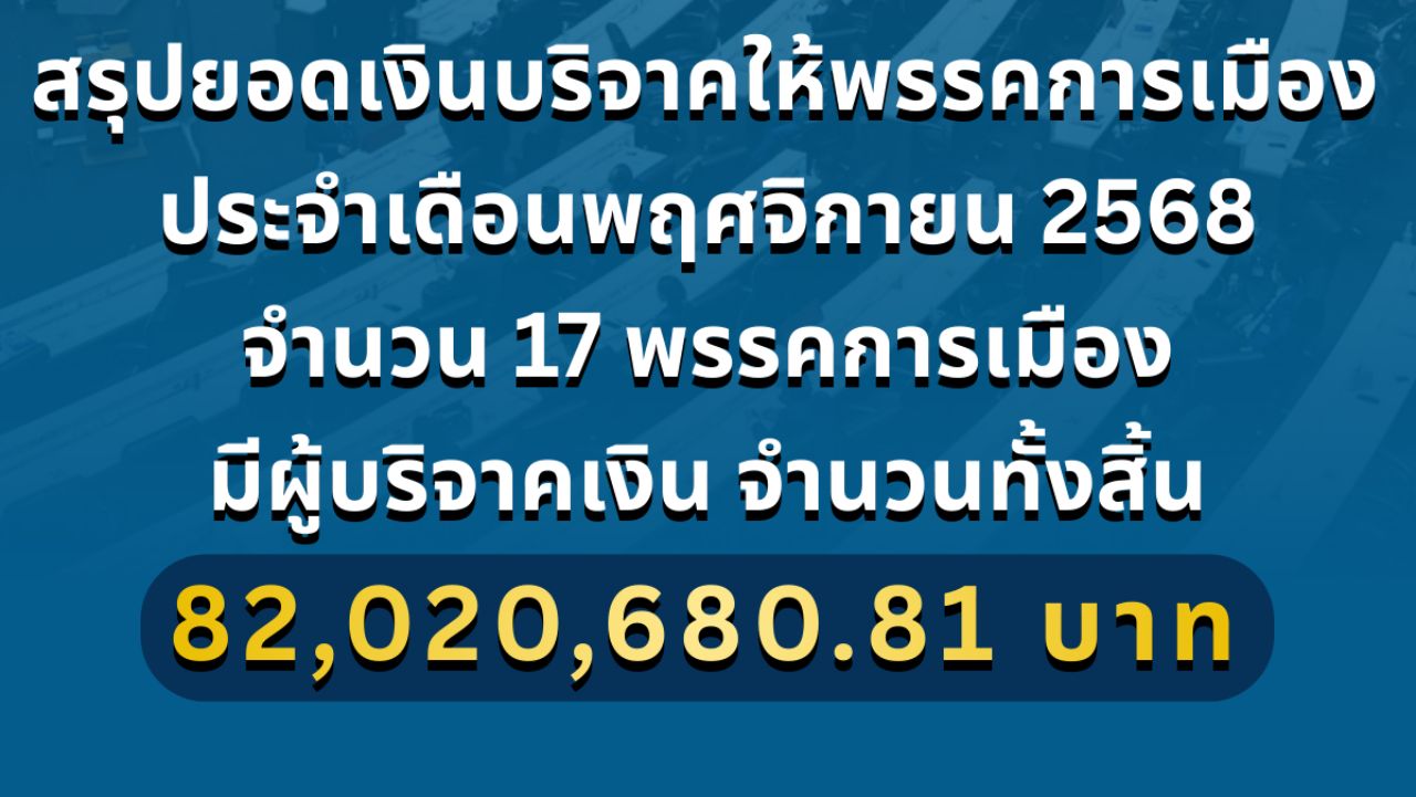 กกต.เปิดยอดเงินบริจาค 17 พรรคการเมือง เดือน พ.ย. 68 ยอดรวมกว่า 82 ล้านบาท ภท.คนบริจาคมากสุด 58 ล้าน ส่วน พท. ได้แค่ 10,000 บาท