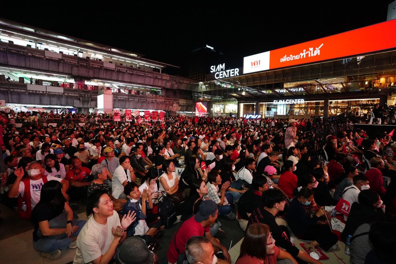 จากนั้นเวลา 17.30 น. ที่ลานพาร์คพารากอน พรรคเพื่อไทยจัดเวทีปราศรัยใหญ่ มีแกนนำพรรคเพื่อไทยเข้าร่วมอย่างพร้อมเพรียง นำโดย นายยศชนัน นายสุริยะ จึงรุ่งเรืองกิจ ผอ.เลือกตั้งและแคนดิเดตนายกฯ นายจุลพันธ์ อมรวิวัฒน์ แคนดิเดตนายกฯ นายประเสริฐ จันทรรวงทอง เลขาธิการพรรคเพื่อไทย นายภูมิธรรม เวชยชัย นายชูศักดิ์ ศิรินิล แกนนำพรรค นายจาตุรนต์ ฉายแสง ประธานคณะกรรมการรณรงค์สื่อสารประชามติและรัฐธรรมนูญฉบับประชาชน พรรคเพื่อไทย โดย น.ส.แพทองธาร ชินวัตร อดีตนายกฯ ในฐานะหัวหน้าครอบครัวเพื่อไทย ได้มาร่วมเวทีดังกล่าวด้วย