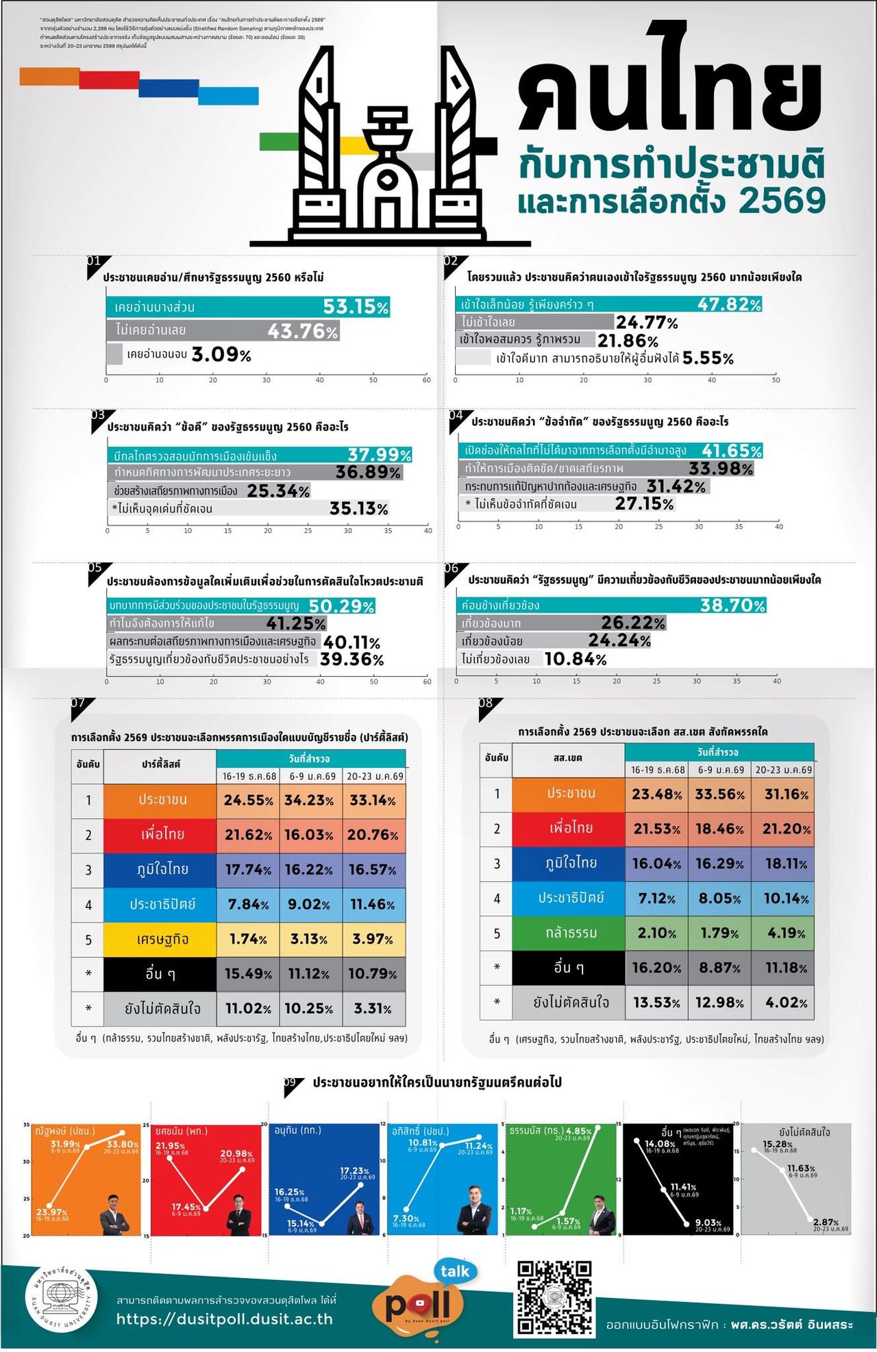 วันที่ 25 มกราคม 2569 สวนดุสิตโพล มหาวิทยาลัยสวนดุสิต สำรวจความคิดเห็นประชาชนทั่วประเทศ เรื่อง “คนไทยกับการทำประชามติและการเลือกตั้ง 2569” จากกลุ่มตัวอย่างจำนวน 2,269 คน โดยใช้วิธีการสุ่มตัวอย่างแบบแบ่งชั้น (Stratified Random Sampling) ตามภูมิภาคหลักของประเทศ กำหนดสัดส่วนตามโครงสร้างประชากรจริง เก็บข้อมูลรูปแบบผสมผสานระหว่างภาคสนาม (ร้อยละ 70) และออนไลน์ (ร้อยละ 30) ระหว่างวันที่ 20-23 มกราคม 2569 สรุปผลได้ดังนี้