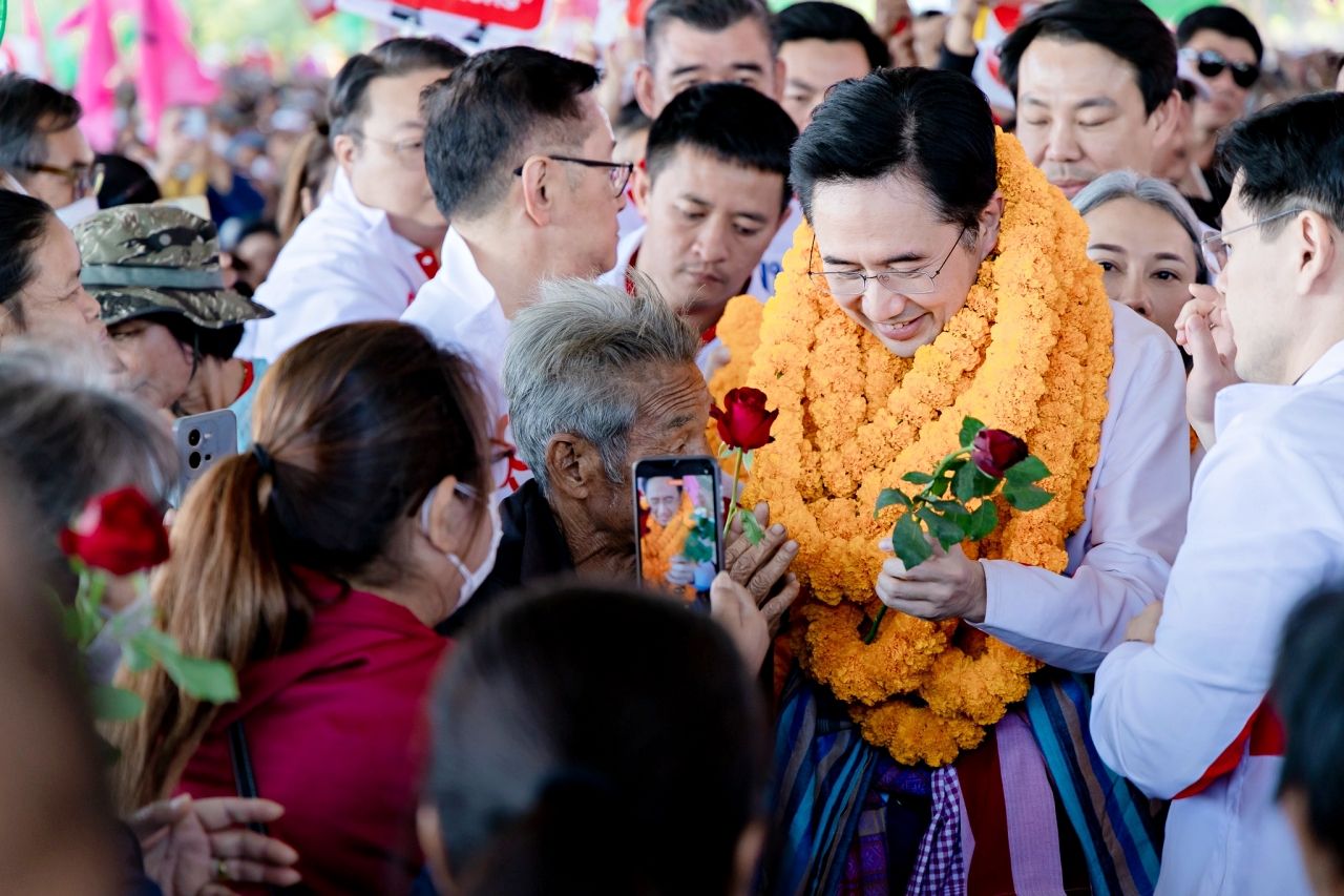 ตนดูจากหน่วยก้านของผู้สมัครคนนี้ ก็เห็นว่าเขาจะได้เป็น สส.สมัยแรก และเป็น สส.ไม่เกิน 2 สมัยก็จะได้เป็นรัฐมนตรี วันนี้พรรคเพื่อไทยมาที่นี่ ไม่ใช่แค่หาเสียงอย่างเดียว แต่มาเพื่อปลอบใจพี่น้องด้วย เพราะพี่น้องหลายคนบอกตนว่าเสียใจ เจ็บใจ และถามตนว่าทำไม สส.จึงหนีไป ดังนั้นพรรคเพื่อไทยจึงไม่มาไม่ได้ ถ้าไม่มาพื้นที่นี้ก็จะกลายเป็นว่าพรรคเพื่อไทยทอดทิ้งชาวเมืองพลไป แต่เราไม่มีทิ้ง พรรคเพื่อไทยยังอยู่ที่นี่