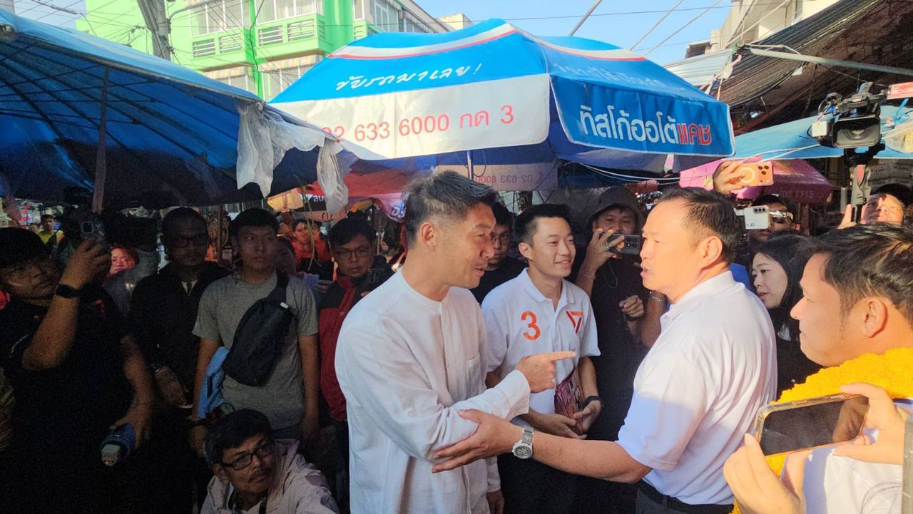 ผู้สื่อข่าวรายงานว่า ระหว่างเดินอยู่ในตลาดเจ้าพรหม นายอนุทินได้เจอกับนายธนาธร จึงรุ่งเรืองกิจ ประธานคณะก้าวหน้า ในฐานะผู้ช่วยหาเสียงพรรคประชาชน ซึ่งเมื่อพบนายอนุทินได้โบกมือให้ ก่อนจะเดินเข้าไป ยกมือไหว้สวัสดีกัน พร้อมจับมือพูดคุยทักทายกัน เช่นเดียวกับผู้สมัคร สส. เขต 1 ของทั้ง 2 พรรค นายทรงพล และนายทวิวงศ์ โตทวิวงศ์ ผู้สมัคร สส. เขต 1 พรรคประชาชน ได้จับมือทักทายกันด้วย
