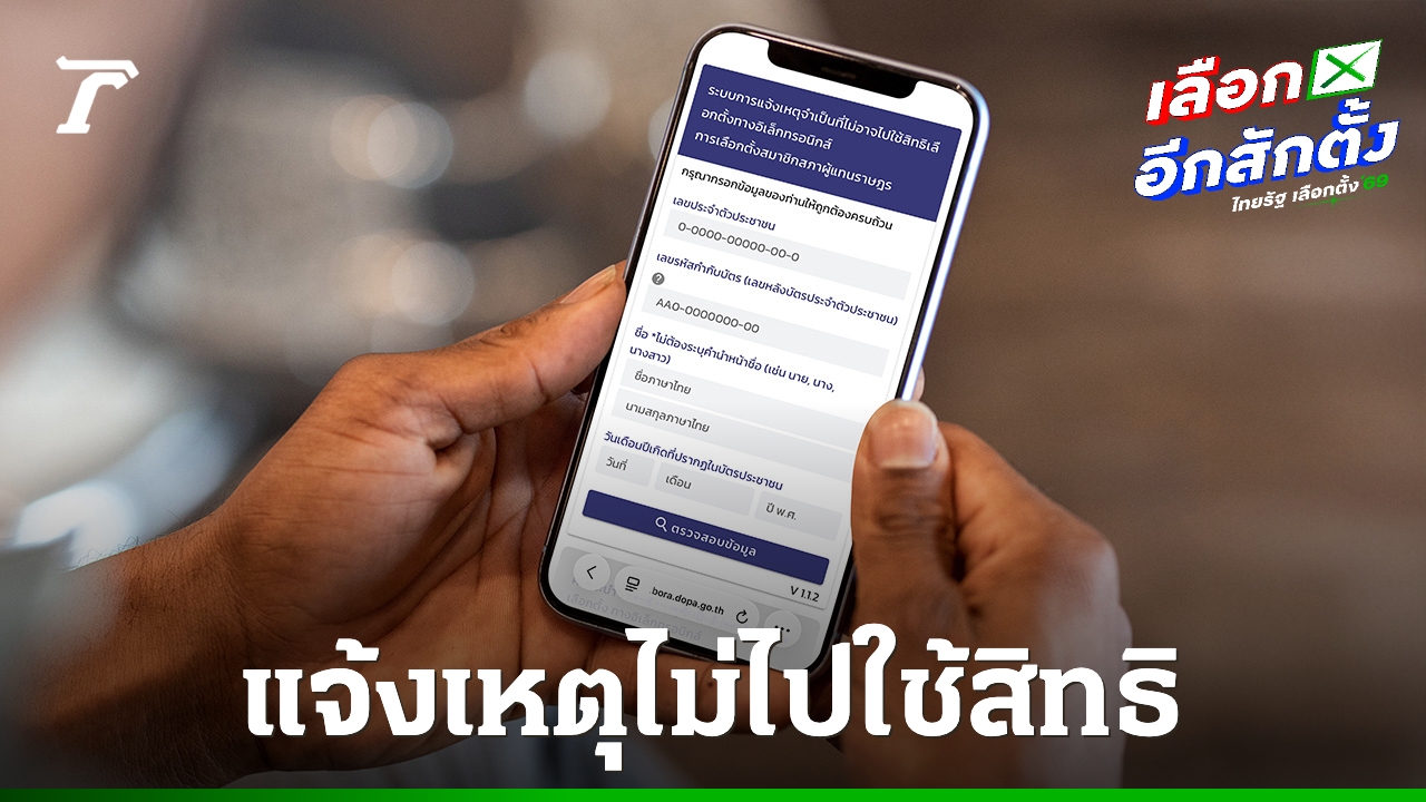 ย้ำช่องทาง “แจ้งเหตุไม่ไปใช้สิทธิเลือกตั้ง 2569 - แจ้งเหตุไม่ไปใช้สิทธิออกเสียงประชามติ” ทำผ่านได้ทั้งแอปพลิเคชัน - เว็บไซต์ - ไปรษณีย์ ย้ำ แจ้งเหตุวันสุดท้าย 15 ก.พ. 2569