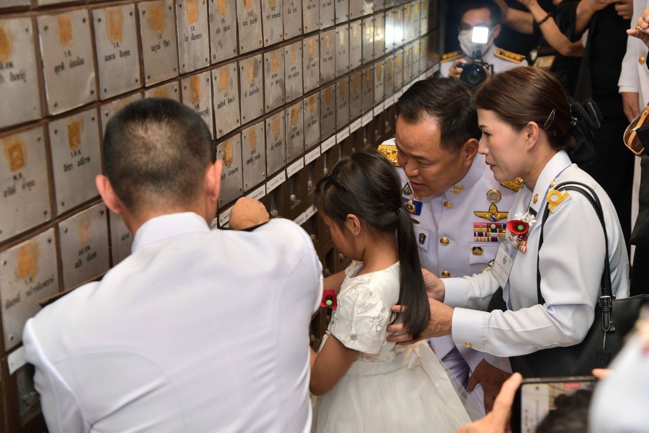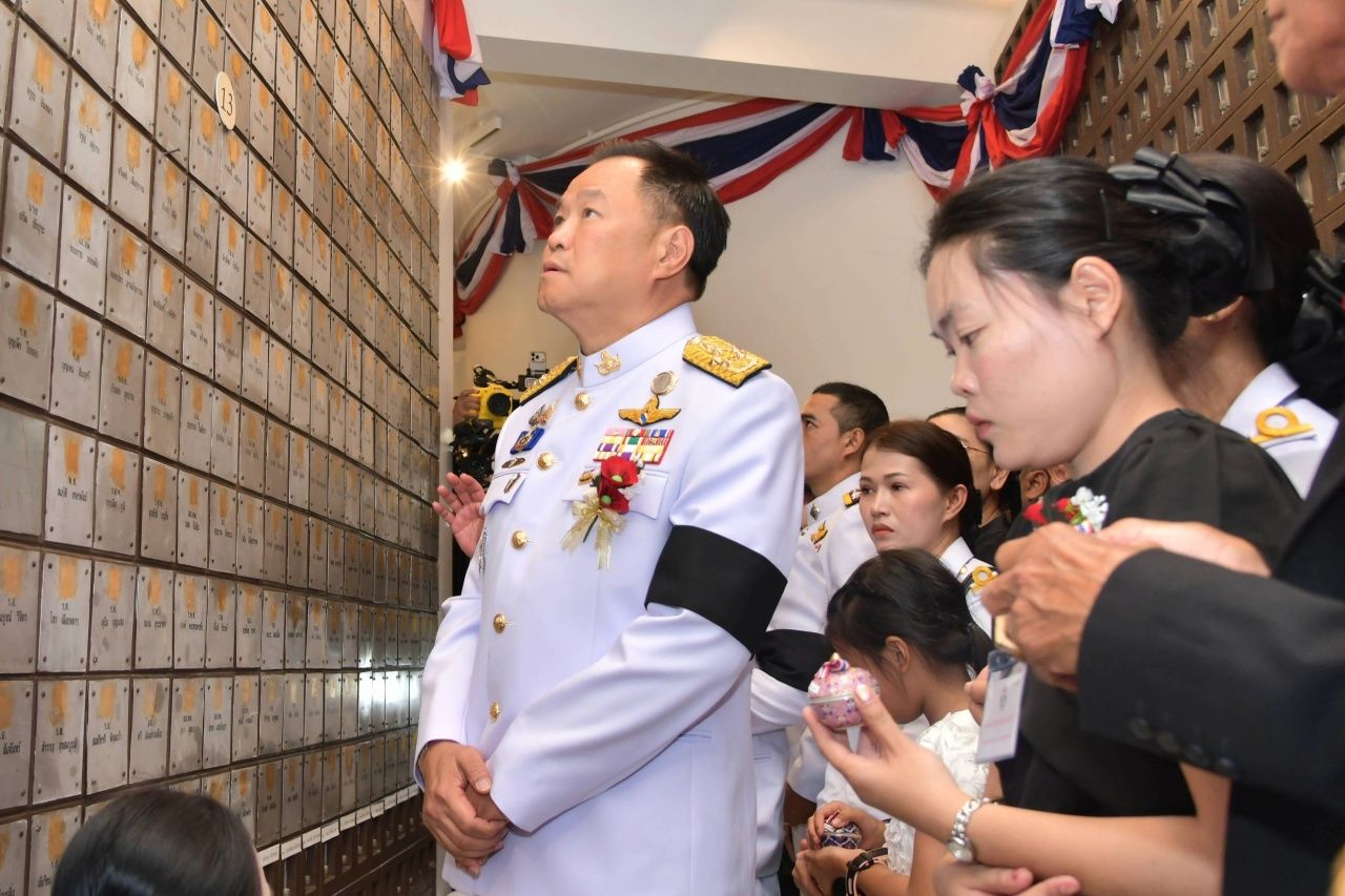 สำหรับการบรรจุอัฐิ จะเรียงตามตัวอักษรพยัญชนะไทย จำนวน 41 นาย ส่วนอีก 1 นาย ซึ่งนับถือศาสนาอิสลาม ไม่ได้มีการบรรจุอัฐิ แต่มีการติดชื่อร่วมกับทหารนายอื่น โดยนายอนุทิน ยังได้ทักทายญาติทหารผู้เสียชีวิต และทหารผ่านศึก ซึ่งมีทหารผ่านศึกบางคนขอบคุณนายอนุทิน ที่ดูแลชายแดนไทย-กัมพูชาอย่างเต็มที่ และอวยพรให้เป็นนายกรัฐมนตรีอีกสมัย ช่วงหนึ่งนายอนุทินได้พบกับ “น้องมีสุข” ลูกสาวคนโตของ “จ่าเพียว” พล.ต.ศตวรรษ สุจริต วีรบุรุษทหารกล้า โดยนายกรัฐมนตรีได้บอกว่า “คิดถึงตลอด เดี๋ยวลุงจะไปหาที่จังหวัดร้อยเอ็ด” จากนั้นน้องมีสุข ได้เดินไปส่งนายกรัฐมนตรีขึ้นรถ ซึ่งนายกรัฐมนตรีได้สวมกอดพร้อมบอกว่า “เดี๋ยวจะไปหาที่ร้อยเอ็ด จำได้หรือไม่”