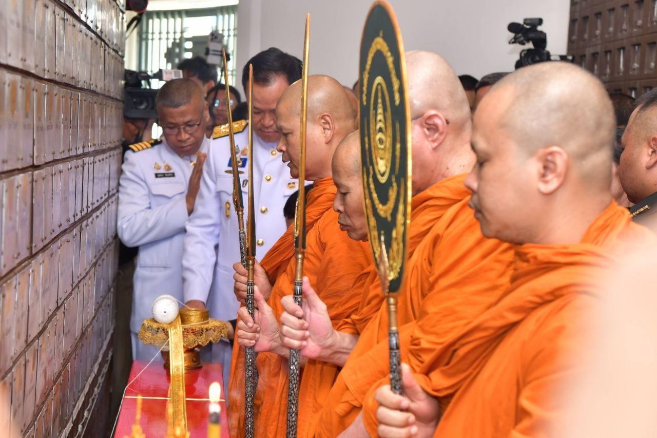 จากนั้น นายกรัฐมนตรีประกอบพิธีบรรจุอัฐิทหารผ่านศึกผู้เสียชีวิตจากการปฏิบัติหน้าที่จำนวน 42 นาย ลงในบล็อกที่ 13 ในช่องที่กำหนด และยืนสงบนิ่ง ต่อมาพลแตรเดี่ยวเป่าสัญญาณแตรนอน-แตรเคารพ 1 จบ เจ้าหน้าที่สั่งพัก แล้วอนุศาสนาจารย์เรียนเชิญนายกรัฐมนตรี ประธานในพิธี จุดเครื่องทองน้อย และทอดผ้าบังสุกุลถวายแด่พระสงฆ์ จำนวน 4 รูป พระสงฆ์ทั้ง 4 รูป พิจารณาผ้าบังสุกุล ก่อนที่นายกรัฐมนตรีจะประกอบพิธีกรวดน้ำเพื่ออุทิศส่วนกุศลแด่ดวงวิญญาณทหารผ่านศึก และถวายภัตตาหารพร้อมจตุปัจจัยไทยธรรมแด่พระสงฆ์ก่อนเสร็จพิธี
