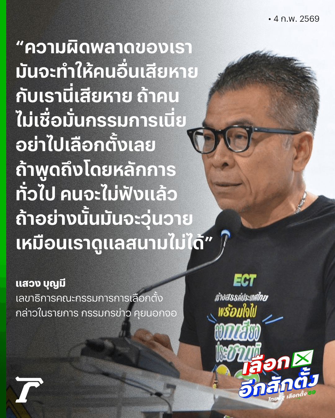 วันที่ 4 กุมภาพันธ์ 2569 นายแสวง บุญมี เลขาธิการคณะกรรมการการเลือกตั้ง (กกต.) ให้สัมภาษณ์ตอนหนึ่งผ่านรายการกรรมกรข่าว คุยนอกจอ ซึ่งนายสรยุทธ สุทัศนะจินดา ผู้ดำเนินรายการ ถามเรื่องความบกพร่องหลายเรื่องในวันเลือกตั้งล่วงหน้า (1 กุมภาพันธ์) ว่า ถ้าคนไม่เชื่อมั่นกรรมการ แข่งขันลำบากมาก แต่นี่มันทำให้คนขาดความเชื่อมั่นเรา เราก็ต้องไปขอว่าที่พูดมันจริงเท็จอย่างไร การเลือกตั้งต้องยึดเจตจำนงประชาชน ที่ไม่ได้พูดเพราะคิดว่าคนจะเข้าใจมาตลอด ถือโอกาสวันนี้เล่าให้ฟัง และความจริงมันจะอธิบายเรื่องนั้นเอง จริงๆ เราไม่มีเพื่อนสักคนนะตอนนี้ เพื่อนเราคือข้อกฎหมายกับความจริง กฎหมายว่าอย่างไรเราก็ว่าตามนั้น ความจริงเกิดอะไรขึ้นเอามาดู ไม่ใช่ไปเต้นตามข้อกล่าวหา มันอาจจะใช้เวลาในการค้นหาความจริง แต่มันเสียหายไปแล้ว