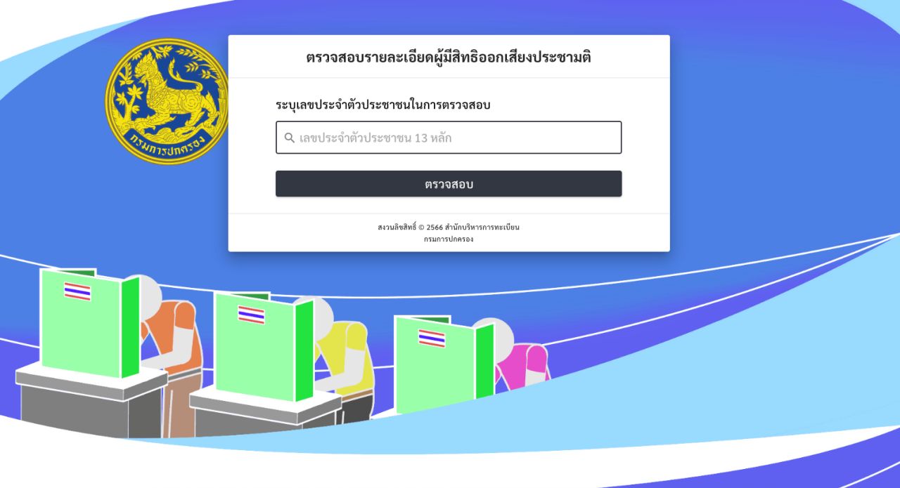สำหรับผู้มีสิทธิเลือกตั้ง สามารถเช็กสิทธิได้ง่าย ๆ ออนไลน์แค่กรอกเลขบัตรประชาชน 13 หลักผ่านเว็บไซต์สำนักบริหารการทะเบียน กรมการปกครอง ดังนี้