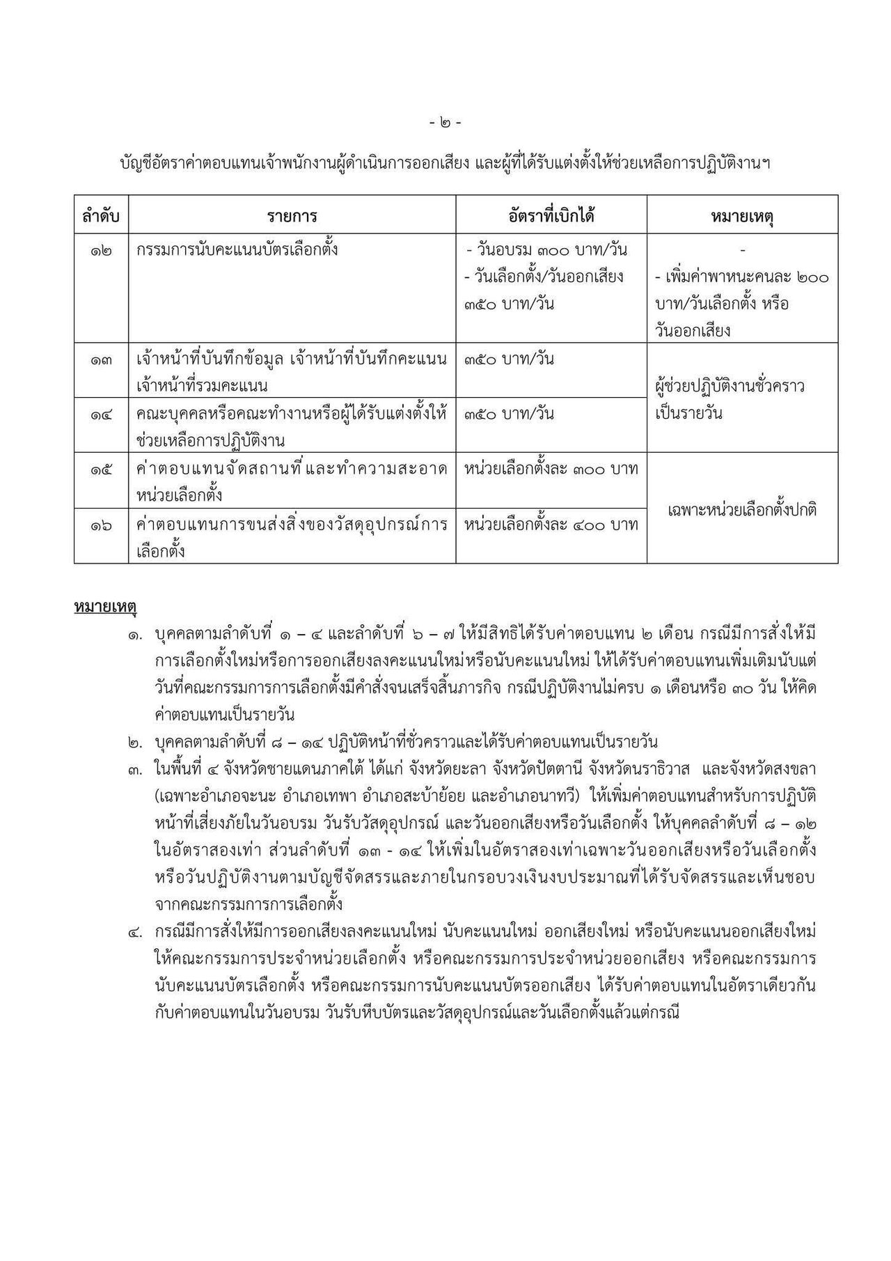 ในช่วงท้ายของบัญชีอัตราค่าตอบแทนด้วยว่า บุคคลตามลำดับที่ 1-4 และลำดับที่ 6-7 ให้มีสิทธิได้รับค่าตอบแทน 2 เดือน กรณีมีการสั่งให้มีการเลือกตั้งใหม่หรือการออกเสียงลงคะแนนใหม่ หรือนับคะแนนใหม่ ให้ได้รับค่าตอบแทนเพิ่มเติมนับแต่วันที่คณะกรรมการการเลือกตั้งมีคำสั่งจนเสร็จสิ้นภารกิจ กรณีปฏิบัติงานไม่ครบ 1 เดือนหรือ 30 วันให้คิดค่าตอบแทนเป็นรายวัน