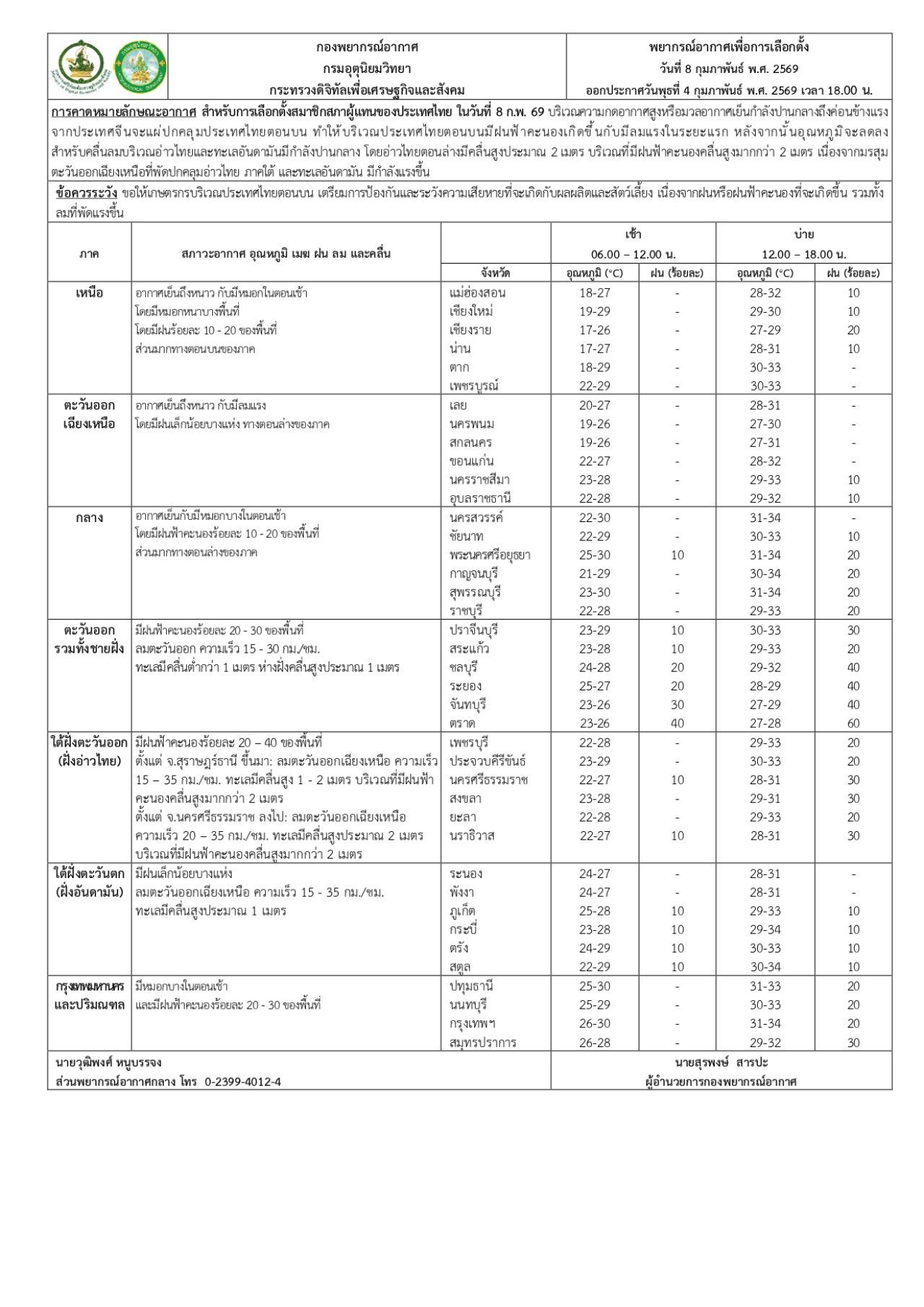 วันที่ 5 กุมภาพันธ์ 2569 เว็บไซต์กรมอุตุนิยมวิทยา เผยแพร่ พยากรณ์อากาศเพื่อการเลือกตั้ง โดยระบุว่า สำหรับการเลือกตั้งสมาชิกสภาผู้แทนราษฎรของประเทศไทย ในวันที่ 8 ก.พ. 2569 บริเวณความกดอากาศสูงหรือมวลอากาศเย็นกำลังปานกลางถึงค่อนข้างแรงจากประเทศจีนจะแผ่ปกคลุมประเทศไทยตอนบน ทำให้บริเวณประเทศไทยตอนบนมีฝนฟ้าคะนองเกิดขึ้นกับมีลมแรงในระยะแรก