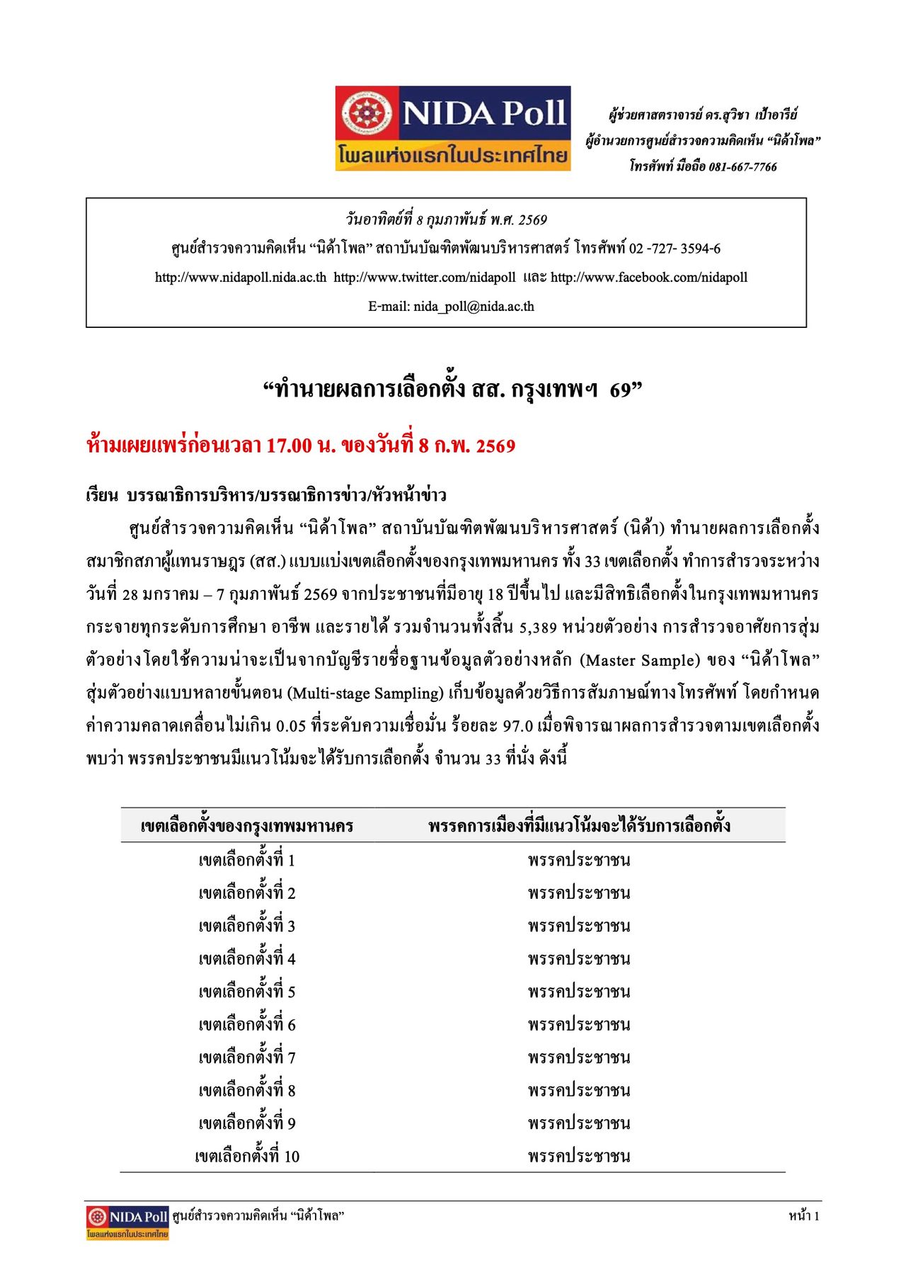 เมื่อเวลา 17.00 น. วันที่ 8 กุมภาพันธ์ 2569 ศูนย์สำรวจความคิดเห็น นิด้าโพล สถาบันบัณฑิตพัฒนบริหารศาสตร์ (นิด้า) ทำนายผลการเลือกตั้งสมาชิกสภาผู้แทนราษฎร (สส.) แบบแบ่งเขตเลือกตั้งของกรุงเทพมหานคร ทั้ง 33 เขตเลือกตั้ง ทำการสำรวจระหว่างวันที่ 28 มกราคม - 7 กุมภาพันธ์ 2569 จากประชาชนที่มีอายุ 18 ปีขึ้นไป และมีสิทธิเลือกตั้งในกรุงเทพมหานครกระจายทุกระดับการศึกษา อาชีพ และรายได้ รวมจำนวนทั้งสิ้น 5,389 หน่วยตัวอย่าง การสำรวจอาศัยการสุ่มตัวอย่างโดยใช้ความน่าจะเป็นจากบัญชีรายชื่อฐานข้อมูลตัวอย่างหลัก (Master Sample) ของ “นิด้าโพล” สุ่มตัวอย่างแบบหลายขั้นตอน (Multi-stage Sampling) เก็บข้อมูลด้วยวิธีการสัมภาษณ์ทางโทรศัพท์ โดยกำหนดค่าความคลาดเคลื่อนไม่เกิน 0.05 ที่ระดับความเชื่อมั่น ร้อยละ 97.0
