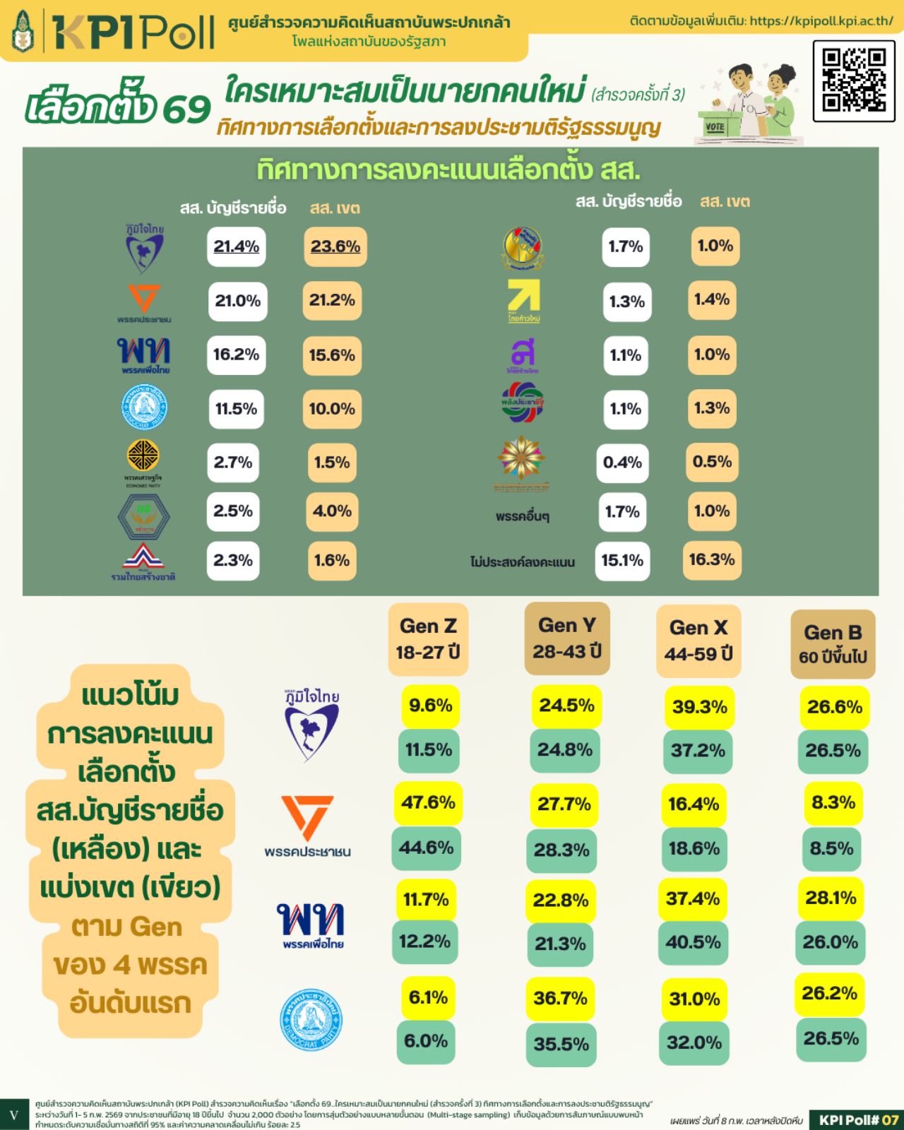 ทั้งนี้ การคาดการณ์ สส. แบบแบ่งเขต 6 อันดับแรก พบว่า พรรคภูมิใจไทย ได้ สส.แบบแบ่งเขต 113-130 ที่นั่ง สส.บัญชีรายชื่อ 21 ที่นั่ง รวม 134-151 ที่นั่ง, พรรคประชาชน ได้ สส.แบบแบ่งเขต 100-115 ที่นั่ง สส.บัญชีรายชื่อ 28 ที่นั่ง รวม 128-143 ที่นั่ง, พรรคเพื่อไทย ได้ สส.แบบแบ่งเขต 80-195 ที่นั่ง สส.บัญชีรายชื่อ 20 ที่นั่ง รวม 100-115 ที่นั่ง, พรรคกล้าธรรม ได้ สส.แบบแบ่งเขต 25-35 ที่นั่ง สส.บัญชีรายชื่อ 3 ที่นั่ง รวม 28-38 ที่นั่ง, พรรคประชาธิปัตย์ ได้ สส.แบบแบ่งเขต 10-15 ที่นั่ง สส.บัญชีรายชื่อ 11 ที่นั่ง รวม 21-26 ที่นั่ง, พรรคประชาชาติ ได้ สส.แบบแบ่งเขต 8-10 ที่นั่ง สส.บัญชีรายชื่อ 1 ที่นั่ง รวม 9-11 ที่นั่ง