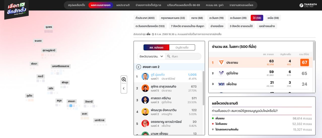 ผลคะแนนเลือกตั้ง 2569 อย่างไม่เป็นทางการ "สงขลาเขต 2" เวลา 18.30 น. พบ "จูรี นุ่มแก้ว" พรรคประชาธิปัตย์ ผลสูสี "หมอสุภัทร" พรรคประชาชน