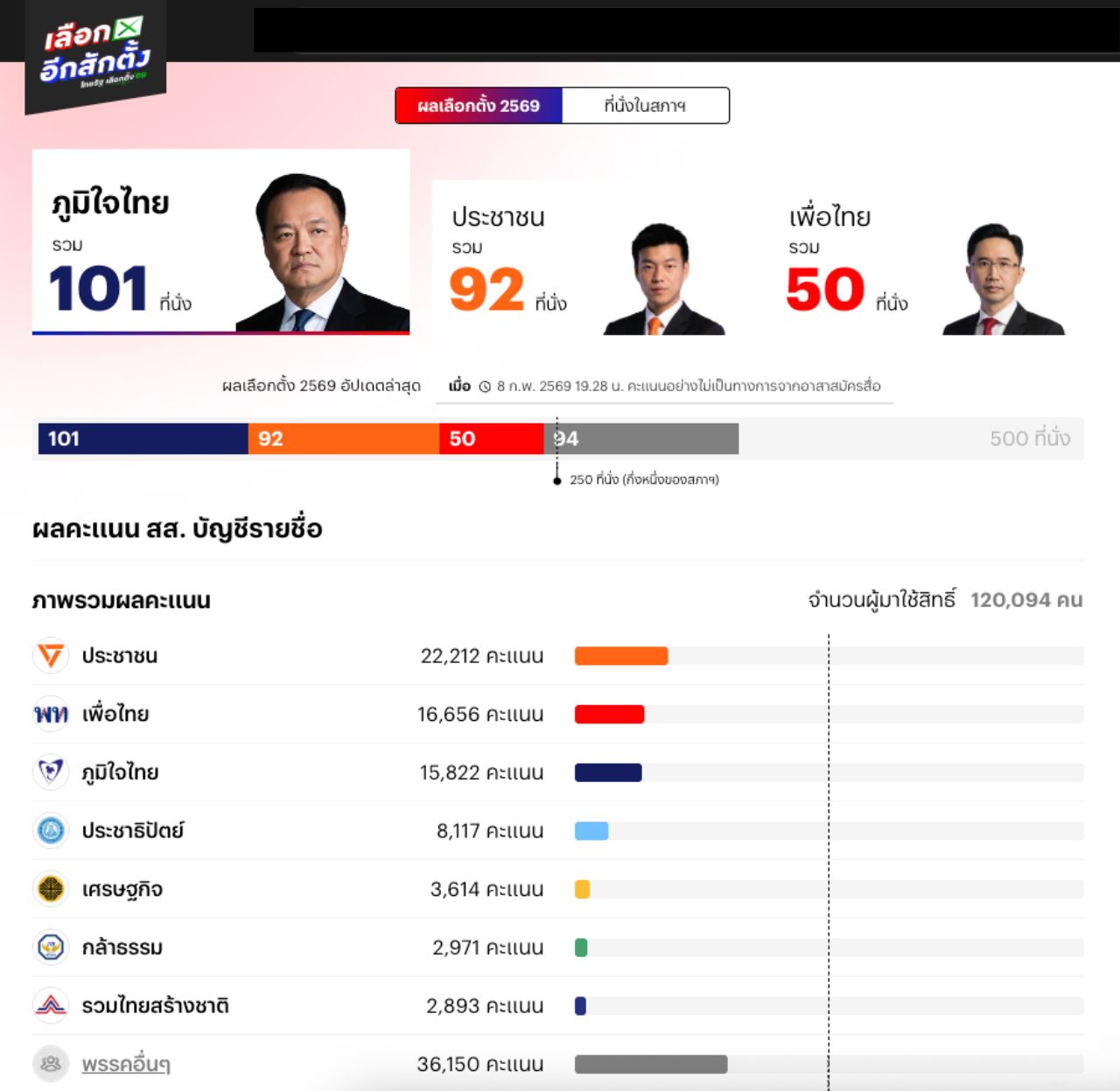 19.30 น. นับคะแนน หลังปิดหีบ 2 ชั่วโมงครึ่ง ผลอย่างไม่เป็นทางการ "ภูมิใจไทย" เริ่มนำ "ประชาชน" หลักสิบคน ยังลุ้นหนัก