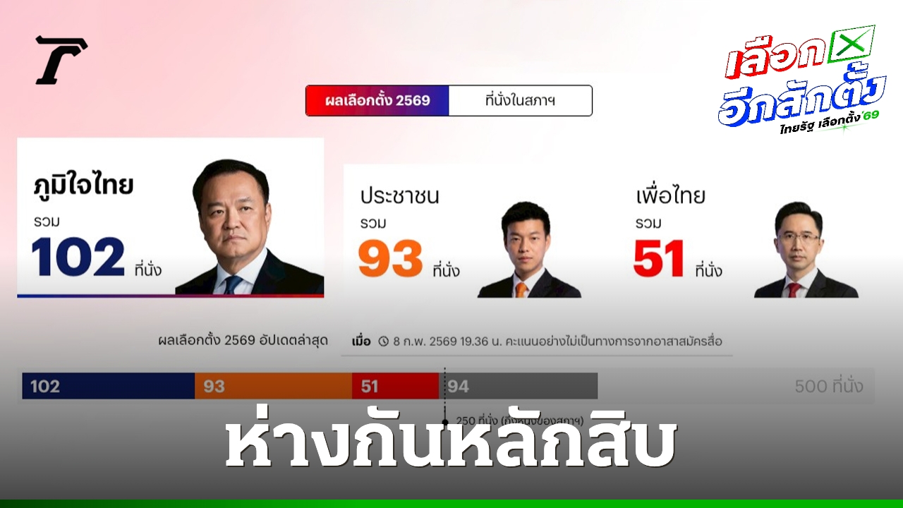 วันที่ 8 ก.พ. 69 ผู้สื่อข่าวรายงานบรรยากาศ หลังปิดหีบเลือกตั้ง ล่าสุด เมื่อเวลา 19.30 น. ซึ่งผ่านการนับคะแนนไปแล้วประมาณ 2 ชั่วโมงครึ่ง พบว่า ภาพรวม พรรคภูมิใจไทย เริ่มมีคะแนนนำ พรรคประชาชน แต่ยังลุ้นหนัก เพราะการนับคะแนนยังไม่เสร็จสิ้น