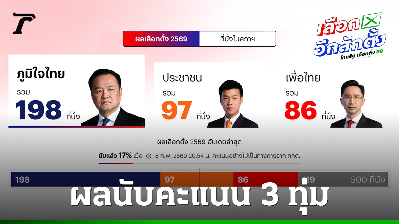 เลือกตั้ง 2569 : ผลนับคะแนน 3 ทุ่ม "ภูมิใจไทย" อันดับ 1 นำห่าง "พรรคประชาชน" อันดับ 2 ส่วน "เพื่อไทย" อยู่อันดับที่ 3
