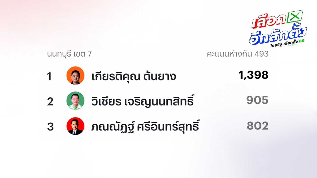เขต 7 เกียรติคุณ ต้นยาง เบอร์ 1 ประชาชน คะแนนนำ วิเชียร เจริญนนทสิทธิ์ เบอร์ 6 กล้าธรรม