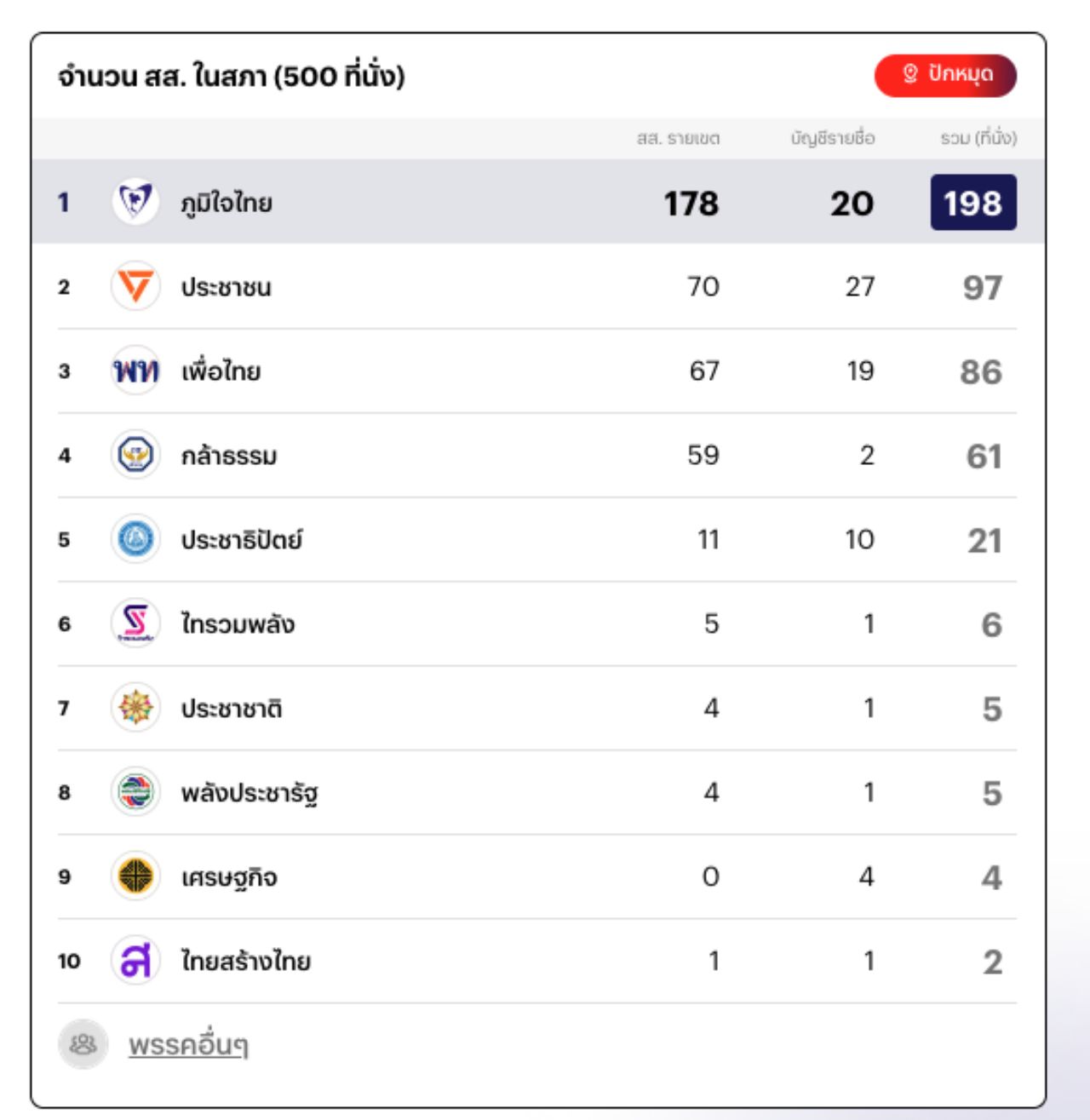 ณ เวลา 22.20 น. พบว่าผลการนับคะแนนอย่างไม่เป็นทางการ "พรรคภูมิใจไทย" มีจำนวน สส.บัญชีรายชื่อ จำนวน 20 ที่นั่ง