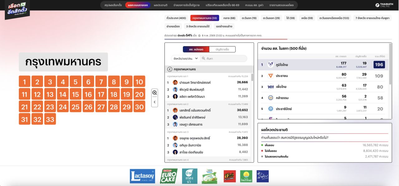 สำหรับ ผลเลือกตั้ง 2569 อัปเดตล่าสุด เมื่อเวลา 23.04 น. นับแล้ว 53% คะแนนอย่างไม่เป็นทางการจาก กกต. โดยพบว่า "พรรคประชาชน" คะแนนนำเป็นอันดับ 1 กวาดครบทั้ง 33 เขต ในพื้นที่กรุงเทพมหานคร