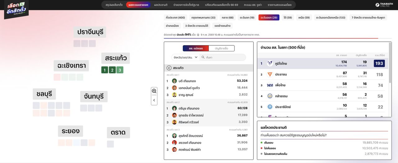 โดยอัปเดตล่าสุด เมื่อเวลา 10.48 น. นับแล้ว 94% คะแนนอย่างไม่เป็นทางการจาก กกต. พบว่า ในการเลือกตั้งสมาชิกสภาผู้แทนราษฎร จ.สระแก้ว